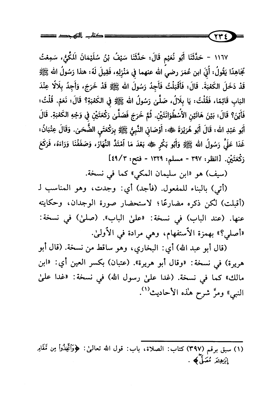 1167 - حَدَّثَنَا أَبُو نُعَيْمٍ، قَال: حَدَّثَنَا سَيْفُ بْنُ سُلَيْمَانَ، سَمِعْتُ مُجَاهِدًا، يَقُولُ: أُتِيَ ابْنُ عُمَرَ رَضِيَ اللَّهُ عَنْهُمَا، فِي مَنْزِلِهِ فَقِيلَ لَهُ: هَذَا رَسُولُ اللَّهِ صَلَّى اللهُ عَلَيْهِ وَسَلَّمَ قَدْ دَخَلَ الكَعْبَةَ، قَال: فَأَقْبَلْتُ فَأَجِدُ رَسُولَ اللَّهِ صَلَّى اللهُ عَلَيْهِ وَسَلَّمَ قَدْ خَرَجَ، وَأَجِدُ بِلالًا عِنْدَ البَابِ قَائِمًا، فَقُلْتُ: يَا بِلالُ أَصَلَّى رَسُولُ اللَّهِ صَلَّى اللهُ عَلَيْهِ وَسَلَّمَ فِي الكَعْبَةِ؟ قَال: نَعَمْ، قُلْتُ: فَأَيْنَ؟ قَال: "بَيْنَ هَاتَيْنِ الأُسْطُوَانَتَيْنِ، ثُمَّ خَرَجَ فَصَلَّى رَكْعَتَيْنِ فِي وَجْهِ الكَعْبَةِ" قَال أَبُو عَبْدِ اللَّهِ: قَال أَبُو هُرَيْرَةَ رَضِيَ اللَّهُ عَنْهُ: "أَوْصَانِي النَّبِيُّ صَلَّى اللهُ عَلَيْهِ وَسَلَّمَ بِرَكْعَتَيِ الضُّحَى" وَقَال عِتْبَانُ بْنُ مَالِكٍ: "غَدَا عَلَيَّ رَسُولُ اللَّهِ صَلَّى اللهُ عَلَيْهِ وَسَلَّمَ، وَأَبُو بَكْرٍ رَضِيَ اللَّهُ عَنْهُ بَعْدَ مَا امْتَدَّ النَّهَارُ، وَصَفَفْنَا وَرَاءَهُ فَرَكَعَ رَكْعَتَيْنِ".