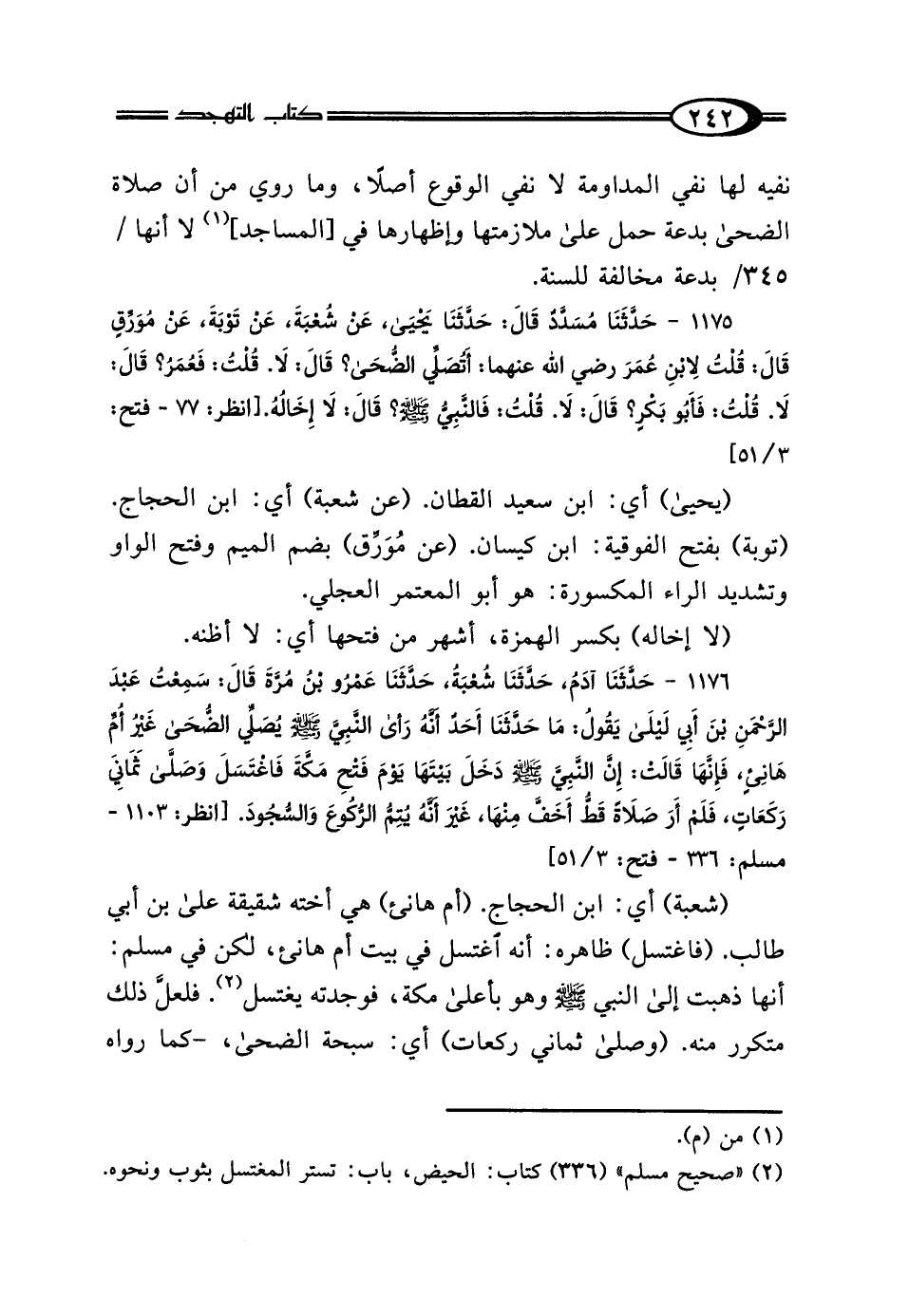 1175 - حَدَّثَنَا مُسَدَّدٌ، قَال: حَدَّثَنَا يَحْيَى، عَنْ شُعْبَةَ، عَنْ تَوْبَةَ، عَنْ مُوَرِّقٍ، قَال: قُلْتُ لِابْنِ عُمَرَ رَضِيَ اللَّهُ عَنْهُمَا: أَتُصَلِّي الضُّحَى؟ قَال: لَا، قُلْتُ: فَعُمَرُ؟ قَال: لَا، قُلْتُ: فَأَبُو بَكْرٍ؟ قَال: لَا، قُلْتُ: فَالنَّبِيُّ صَلَّى اللهُ عَلَيْهِ وَسَلَّمَ؟ قَال: لَا إِخَالُهُ.