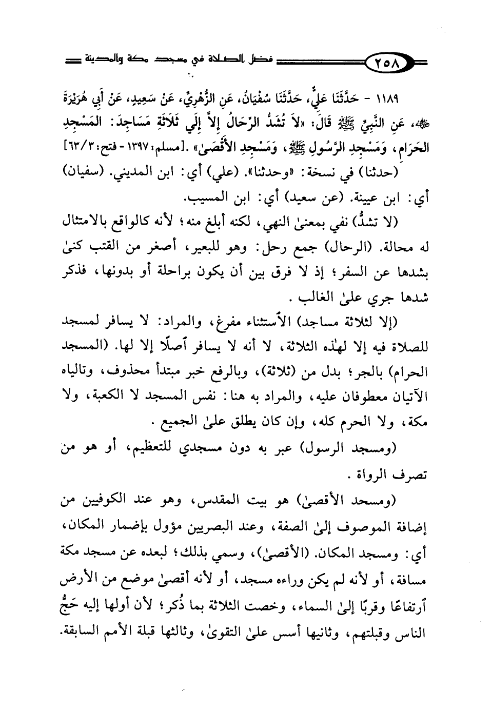 1189 - حَدَّثَنَا عَلِيٌّ، حَدَّثَنَا سُفْيَانُ، عَنِ الزُّهْرِيِّ، عَنْ سَعِيدٍ، عَنْ أَبِي هُرَيْرَةَ رَضِيَ اللَّهُ عَنْهُ، عَنِ النَّبِيِّ صَلَّى اللهُ عَلَيْهِ وَسَلَّمَ قَال: "لَا تُشَدُّ الرِّحَالُ إلا إِلَى ثَلاثَةِ مَسَاجِدَ: المَسْجِدِ الحَرَامِ، وَمَسْجِدِ الرَّسُولِ صَلَّى اللهُ عَلَيْهِ وَسَلَّمَ، وَمَسْجِدِ الأَقْصَى".