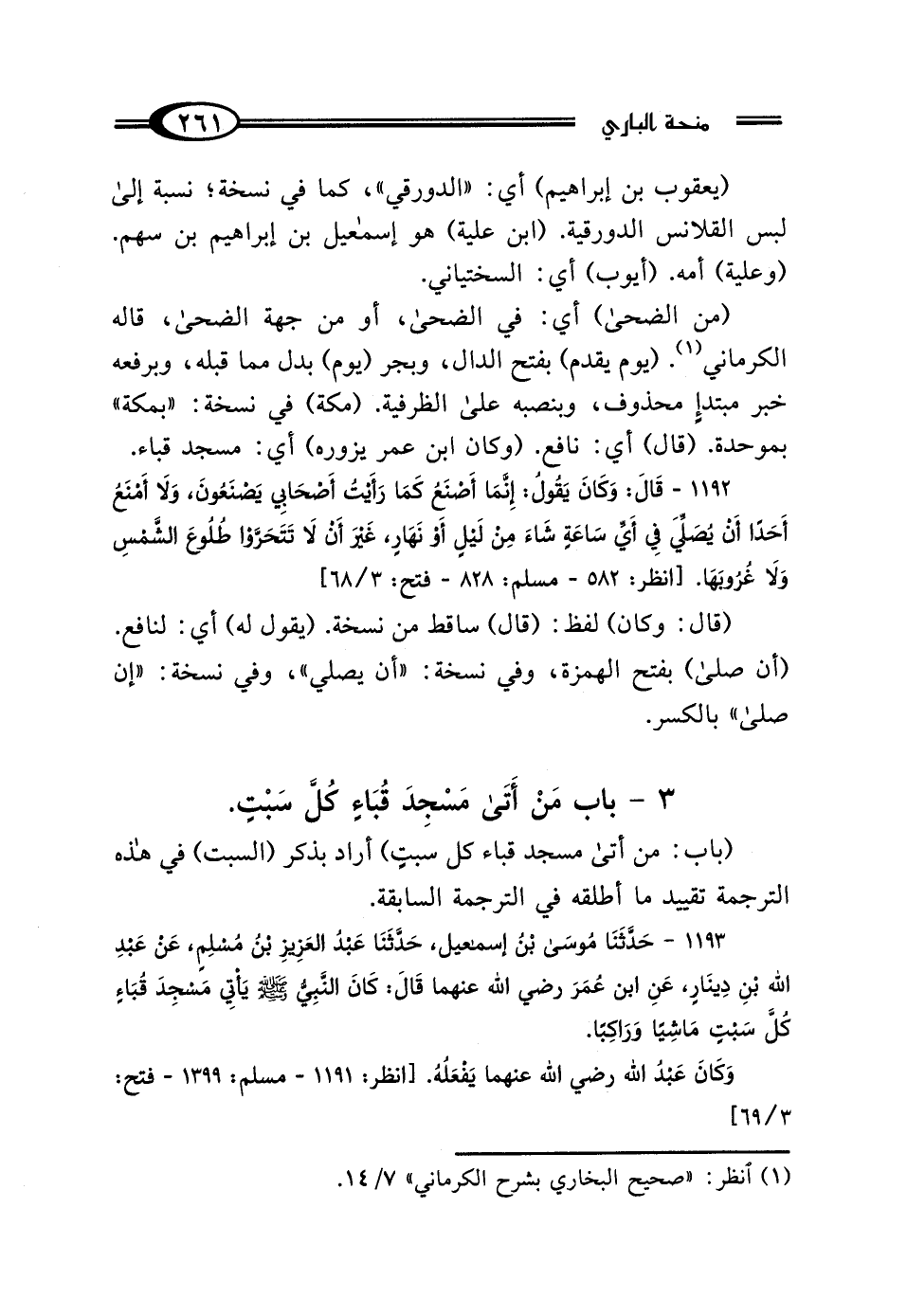 (من الضحى) أي: في الضحى، أو من جهة الضحى، قاله الكرماني (¬1). (يوم يقدم) بفتح الدال، وبجر (يوم) بدل مما قبله، وبرفعه خبر مبتدإٍ محذوف، وبنصبه على الظرفية. (مكة) في نسخة: "بمكة" بموحدة. (قال) أي: نافع. (وكان ابن عمر يزوره) أي: مسجد قباء.