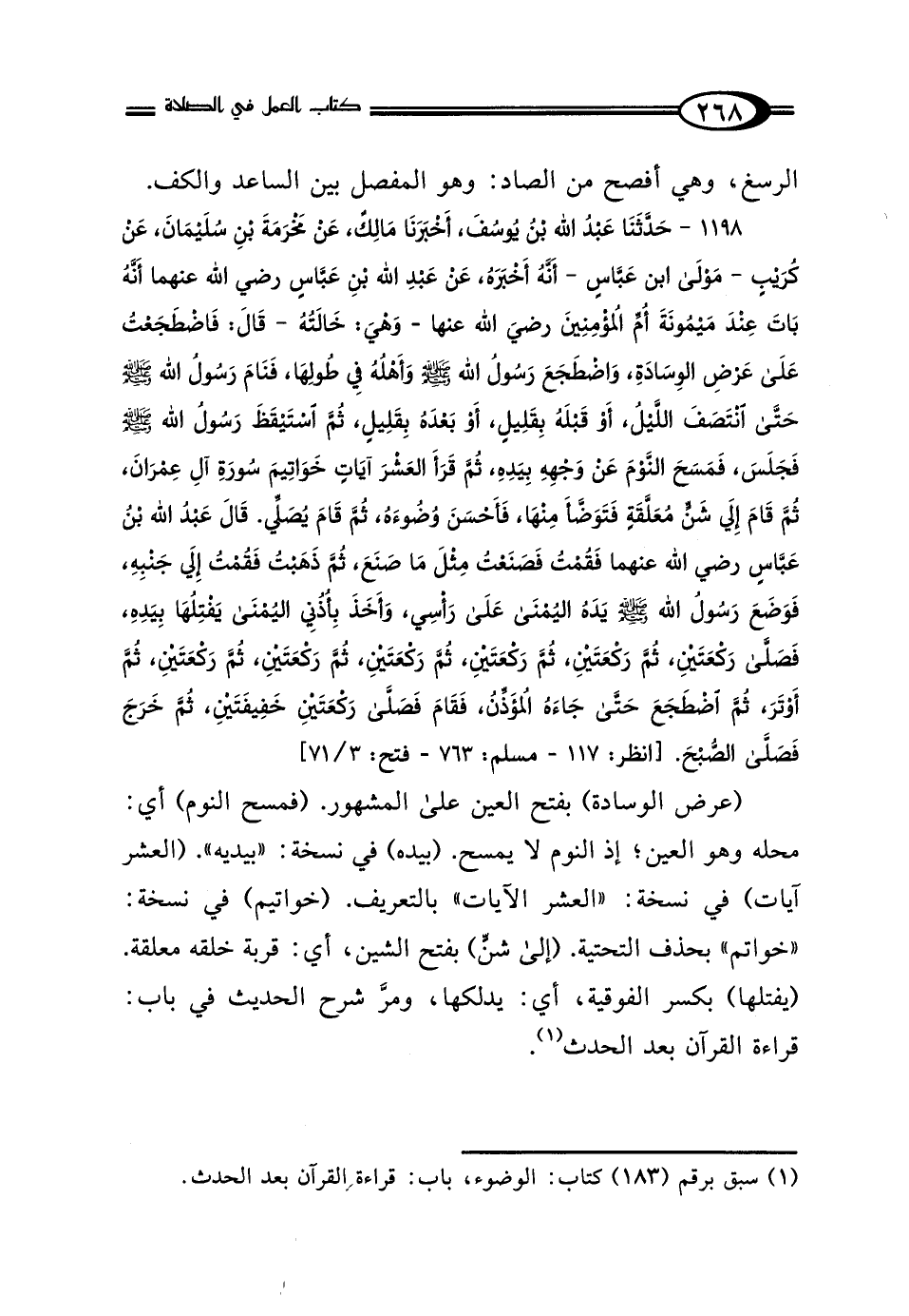 1198 - حَدَّثَنَا عَبْدُ اللَّهِ بْنُ يُوسُفَ، أَخْبَرَنَا مَالِكٌ، عَنْ مَخْرَمَةَ بْنِ سُلَيْمَانَ، عَنْ كُرَيْبٍ، مَوْلَى ابْنِ عَبَّاسٍ: أَنَّهُ أَخْبَرَهُ، عَنْ عَبْدِ اللَّهِ بْنِ عَبَّاسٍ رَضِيَ اللَّهُ عَنْهُمَا: أَنَّهُ بَاتَ عِنْدَ مَيْمُونَةَ أُمِّ المُؤْمِنِينَ رَضِيَ اللَّهُ عَنْهَا - وَهِيَ خَالتُهُ - قَال: فَاضْطَجَعْتُ عَلَى عَرْضِ الوسَادَةِ، "وَاضْطَجَعَ رَسُولُ اللَّهِ صَلَّى اللهُ عَلَيْهِ وَسَلَّمَ وَأَهْلُهُ فِي طُولِهَا، فَنَامَ رَسُولُ اللَّهِ صَلَّى اللهُ عَلَيْهِ وَسَلَّمَ حَتَّى انْتَصَفَ اللَّيْلُ - أَوْ قَبْلَهُ بِقَلِيلٍ، أَوْ بَعْدَهُ بِقَلِيلٍ - ثُمَّ اسْتَيْقَظَ رَسُولُ اللَّهِ صَلَّى اللهُ عَلَيْهِ وَسَلَّمَ، فَجَلَسَ، فَمَسَحَ النَّوْمَ عَنْ وَجْهِهِ بِيَدِهِ، ثُمَّ قَرَأَ العَشْرَ آيَاتٍ خَوَاتِيمَ سُورَةِ آلِ عِمْرَانَ، ثُمَّ قَامَ إِلَى شَنٍّ مُعَلَّقَةٍ، فَتَوَضَّأَ مِنْهَا، فَأَحْسَنَ وُضُوءَهُ، ثُمَّ قَامَ يُصَلِّي" قَال عَبْدُ اللَّهِ بْنُ عَبَّاسٍ رَضِيَ اللَّهُ عَنْهُمَا: فَقُمْتُ فَصَنَعْتُ مِثْلَ مَا صَنَعَ، ثُمَّ ذَهَبْتُ، فَقُمْتُ إِلَى جَنْبِهِ، "فَوَضَعَ رَسُولُ اللَّهِ صَلَّى اللهُ عَلَيْهِ وَسَلَّمَ يَدَهُ اليُمْنَى عَلَى رَأْسِي، وَأَخَذَ بِأُذُنِي اليُمْنَى يَفْتِلُهَا بِيَدِهِ، فَصَلَّى رَكْعَتَيْنِ، ثُمَّ رَكْعَتَيْنِ، ثُمَّ رَكْعَتَيْنِ، ثُمَّ رَكْعَتَيْنِ، ثُمَّ رَكْعَتَيْنِ، ثُمَّ رَكْعَتَيْنِ، ثُمَّ أَوْتَرَ، ثُمَّ اضْطَجَعَ حَتَّى جَاءَهُ المُؤَذِّنُ، فَقَامَ، فَصَلَّى رَكْعَتَيْنِ خَفِيفَتَيْنِ، ثُمَّ خَرَجَ، فَصَلَّى الصُّبْحَ".