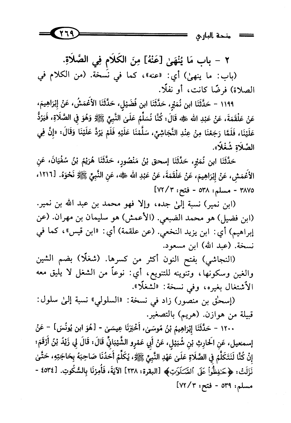 1199 - حَدَّثَنَا ابْنُ نُمَيْرٍ، حَدَّثَنَا ابْنُ فُضَيْلٍ، حَدَّثَنَا الأَعْمَشُ، عَنْ إِبْرَاهِيمَ، عَنْ عَلْقَمَةَ، عَنْ عَبْدِ اللَّهِ رَضِيَ اللَّهُ عَنْهُ، قَال: كُنَّا نُسَلِّمُ عَلَى النَّبِيِّ صَلَّى اللهُ عَلَيْهِ وَسَلَّمَ وَهُوَ فِي الصَّلاةِ، فَيَرُدُّ عَلَيْنَا، فَلَمَّا رَجَعْنَا مِنْ عِنْدِ النَّجَاشِيِّ سَلَّمْنَا عَلَيْهِ، فَلَمْ يَرُدَّ عَلَيْنَا، وَقَال: "إِنَّ فِي الصَّلاةِ شُغْلًا" حَدَّثَنَا ابْنُ نُمَيْرٍ، حَدَّثَنَا إِسْحَاقُ بْنُ مَنْصُورٍ السَّلُولِيُّ، حَدَّثَنَا هُرَيْمُ بْنُ سُفْيَانَ، عَنِ الأَعْمَشِ، عَنْ إِبْرَاهِيمَ، عَنْ عَلْقَمَةَ، عَنْ عَبْدِ اللَّهِ رَضِيَ اللَّهُ عَنْهُ، عَنِ النَّبِيِّ صَلَّى اللهُ عَلَيْهِ وَسَلَّمَ نَحْوَهُ.