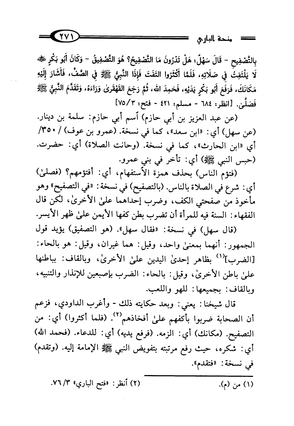 بِالتَّصْفِيحِ - قَال سَهْلٌ: هَلْ تَدْرُونَ مَا التَّصْفِيحُ؟ هُوَ التَّصْفِيقُ - وَكَانَ أَبُو بَكْرٍ رَضِيَ اللَّهُ عَنْهُ، لَا يَلْتَفِتُ فِي صَلاتِهِ، فَلَمَّا أَكْثَرُوا التَفَتَ، فَإِذَا النَّبِيُّ صَلَّى اللهُ عَلَيْهِ وَسَلَّمَ فِي الصَّفِّ، فَأَشَارَ إِلَيْهِ مَكَانَكَ، فَرَفَعَ أَبُو بَكْرٍ يَدَيْهِ فَحَمِدَ اللَّهَ، ثُمَّ رَجَعَ القَهْقَرَى وَرَاءَهُ، "وَتَقَدَّمَ النَّبِيُّ صَلَّى اللهُ عَلَيْهِ وَسَلَّمَ فَصَلَّى".