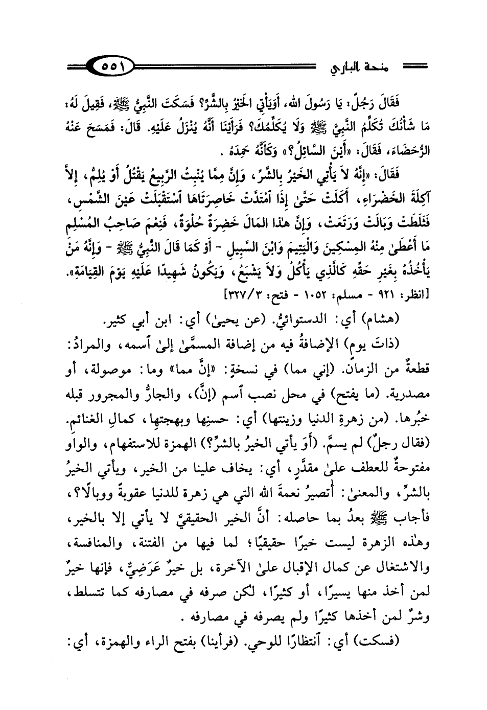 (ذاتَ يومٍ) الإضافةُ فيه من إضافة المسمَّى إلى اسمه، والمرادُ: قطعةٌ من الزّمان. (إنِّي ممّا) في نسخةٍ: "إنَّ مما" وما: موصولة، أو مصدرية. (ما يفتح) في محل نصب اسم (إن)، والجارُّ والمجرور قبله خبُرها. (من زهرةِ الدنيا وزينتها) أي: حسنِها وبهجتهِا، كمالِ الغنائمِ. (فقال رجلٌ) لم يسمَّ. (أَوَ يأتي الخيرُ بالشرِّ؟) الهمزة للاستفهام، والواو مفتوحةٌ للعطف على مقدَّرٍ، أي: يخاف علينا من الخير، ويأتي الخيرُ بالشرِّ، والمعني: أتصيرُ نعمةَ الله الّتي هي زهرة للدنيا عقوبةً ووبالًا؟، فأجاب - صلى الله عليه وسلم - بعدُ بما حاصله: أنَّ الخير الحقيقيَّ لا يأتي إلا بالخير، وهذه الزهرة ليست خيرًا حقيقيًّا؛ لما فيها من الفتنة، والمنافسة، والاشتغال عن كمال الإقبال على الآخرة، بل خيرٌ عَرَضِيٌّ، فإنها خيرٌ لمن أخذ منها يسيرًا، أو كثيرًا، لكن صرفه في مصارفه كما تتسلط، وشرٌّ لمن أخذها كثيرًا ولم يصرفه في مصارفه.