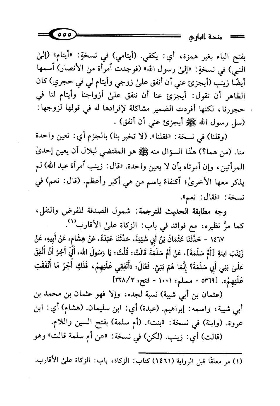 1467 - حَدَّثَنَا عُثْمَانُ بْنُ أَبِي شَيْبَةَ، حَدَّثَنَا عَبْدَةُ، عَنْ هِشَامٍ، عَنْ أَبِيهِ، عَنْ زَيْنَبَ بِنْتِ أُمِّ سَلَمَةَ، عَنْ أُمِّ سَلَمَةَ، قَالتْ: قُلْتُ: يَا رَسُولَ اللَّهِ، أَلِيَ أَجْرٌ أَنْ أُنْفِقَ عَلَى بَنِي أَبِي سَلَمَةَ، إِنَّمَا هُمْ بَنِيَّ؟ فَقَال: "أَنْفِقِي عَلَيْهِمْ، فَلَكِ أَجْرُ مَا أَنْفَقْتِ عَلَيْهِمْ".