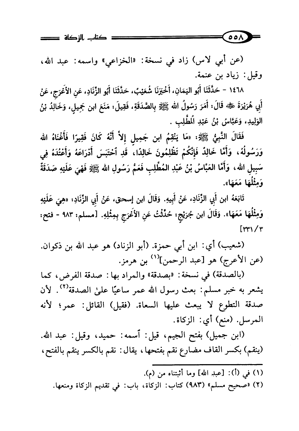 1468 - حَدَّثَنَا أَبُو اليَمَانِ، أَخْبَرَنَا شُعَيْبٌ، حَدَّثَنَا أَبُو الزِّنَادِ، عَنِ الأَعْرَجِ، عَنْ أَبِي هُرَيْرَةَ رَضِيَ اللَّهُ عَنْهُ، قَال: أَمَرَ رَسُولُ اللَّهِ صَلَّى اللهُ عَلَيْهِ وَسَلَّمَ بِالصَّدَقَةِ، فَقِيلَ مَنَعَ ابْنُ جَمِيلٍ، وَخَالِدُ بْنُ الوَلِيدِ، وَعَبَّاسُ بْنُ عَبْدِ المُطَّلِبِ فَقَال النَّبِيُّ صَلَّى اللهُ عَلَيْهِ وَسَلَّمَ: "مَا يَنْقِمُ ابْنُ جَمِيلٍ إلا أَنَّهُ كَانَ فَقِيرًا، فَأَغْنَاهُ اللَّهُ وَرَسُولُهُ، وَأَمَّا خَالِدٌ: فَإِنَّكُمْ تَظْلِمُونَ خَالِدًا، قَدِ احْتَبَسَ أَدْرَاعَهُ وَأَعْتُدَهُ فِي سَبِيلِ اللَّهِ، وَأَمَّا العَبَّاسُ بْنُ عَبْدِ المُطَّلِبِ، فَعَمُّ رَسُولِ اللَّهِ صَلَّى اللهُ عَلَيْهِ وَسَلَّمَ فَهِيَ عَلَيْهِ صَدَقَةٌ وَمِثْلُهَا مَعَهَا " تَابَعَهُ ابْنُ أَبِي الزِّنَادِ، عَنْ أَبِيهِ، وَقَال ابْنُ إِسْحَاقَ: عَنْ أَبِي الزِّنَادِ، "هِيَ عَلَيْهِ وَمِثْلُهَا مَعَهَا" وَقَال ابْنُ جُرَيْجٍ: حُدِّثْتُ عَنِ الأَعْرَجِ بِمِثْلِهِ.