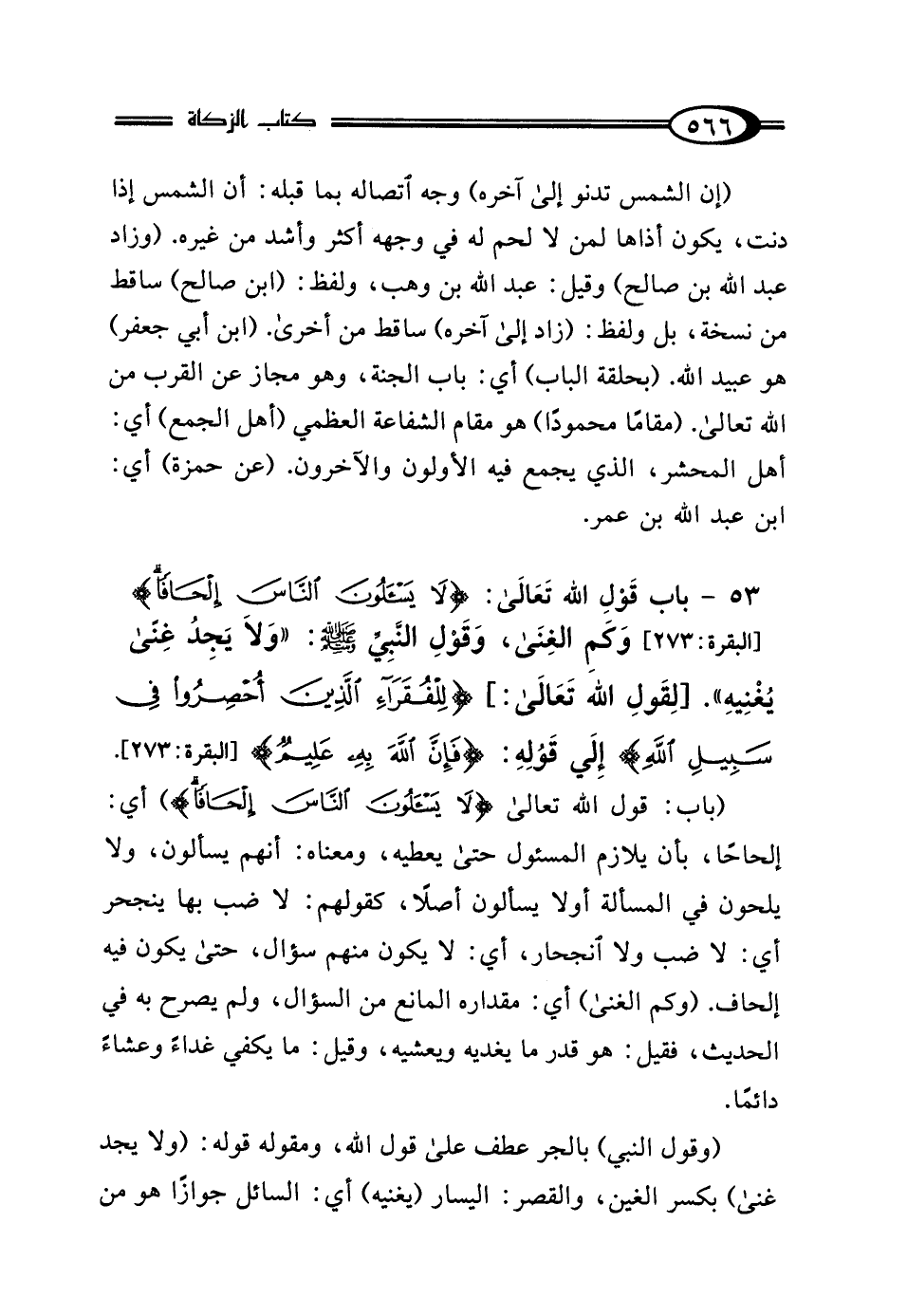 (باب: قول الله تعالى {لَا يَسْأَلُونَ النَّاسَ إِلْحَافًا}) أي: إلحاحًا، بأن يلازم المسئول حتّى يعطيه، ومعناه: أنهم يسألون، ولا يلحون في المسألة أو لا يسالون أصلًا، كقولهم: لا ضب بها ينجحر أي: لا ضب ولا انجحار، أي: لا يكون منهم سؤال، حتّى يكون فيه إلحاف. (وكم الغنى) أي: مقداره المانع من السؤال، ولم يصرح به في الحديث، فقيل: هو قدر ما يغديه ويعشيه، وقيل: ما يكفي غداءً وعشاءً دائمًا.