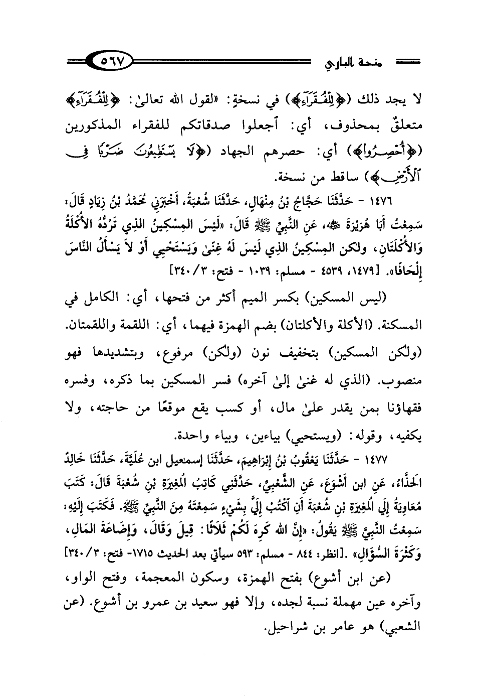 1476 - حَدَّثَنَا حَجَّاجُ بْنُ مِنْهَالٍ، حَدَّثَنَا شُعْبَةُ، أَخْبَرَنِي مُحَمَّدُ بْنُ زِيَادٍ، قَال: سَمِعْتُ أَبَا هُرَيْرَةَ رَضِيَ اللَّهُ عَنْهُ، عَنِ النَّبِيِّ صَلَّى اللهُ عَلَيْهِ وَسَلَّمَ قَال: "لَيْسَ المِسْكِينُ الَّذِي تَرُدُّهُ الأُكْلَةَ وَالأُكْلَتَانِ، وَلَكِنِ المِسْكِينُ الَّذِي لَيْسَ لَهُ غِنًى، وَيَسْتَحْيِي أَوْ لَا يَسْأَلُ النَّاسَ إِلْحَافًا".