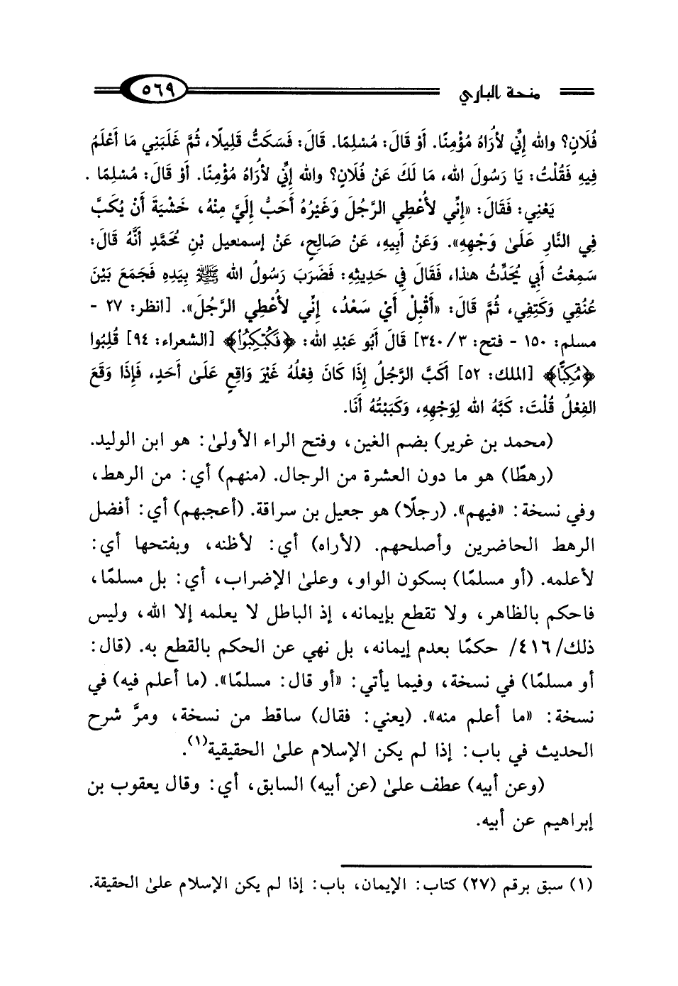 فُلانٍ، وَاللَّهِ إِنِّي لَأَرَاهُ مُؤْمِنًا، قَال: "أَوْ مُسْلِمًا" يَعْنِي: فَقَال: "إِنِّي لَأُعْطِي الرَّجُلَ، وَغَيْرُهُ أَحَبُّ إِلَيَّ مِنْهُ، خَشْيَةَ أَنْ يُكَبَّ فِي النَّارِ عَلَى وَجْهِهِ" وَعَنْ أَبِيهِ، عَنْ صَالِحٍ، عَنْ إِسْمَاعِيلَ بْنِ مُحَمَّدٍ، أَنَّهُ قَال: سَمِعْتُ أَبِي يُحَدِّثُ بِهَذَا، فَقَال: فِي حَدِيثِهِ، فَضَرَبَ رَسُولُ اللَّهِ صَلَّى اللهُ عَلَيْهِ وَسَلَّمَ بِيَدِهِ، فَجَمَعَ بَيْنَ عُنُقِي وَكَتِفِي، ثُمَّ قَال: "أَقْبِلْ أَيْ سَعْدُ إِنِّي لَأُعْطِي الرَّجُلَ".
