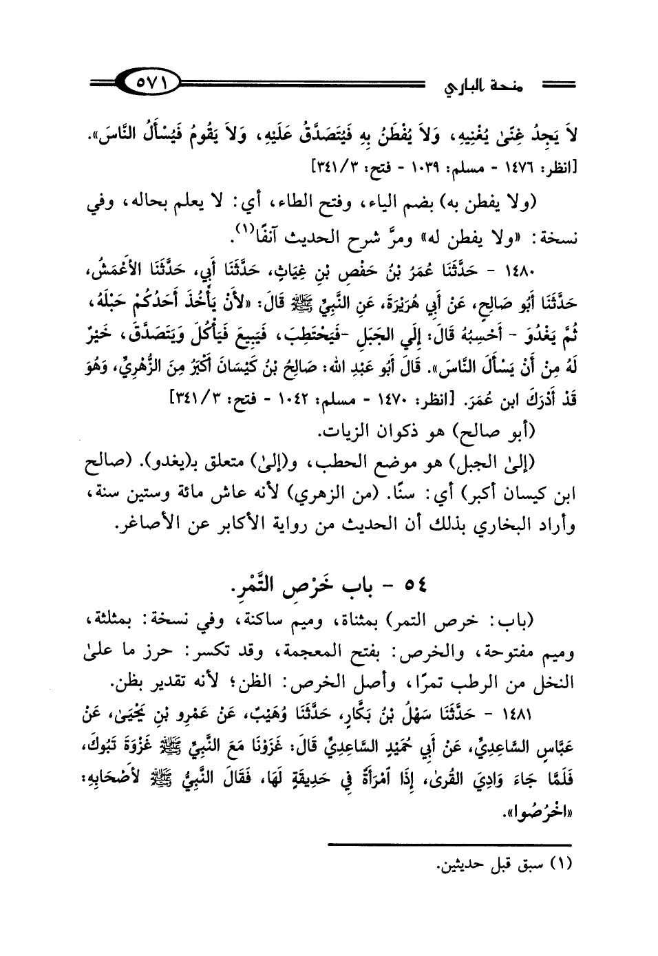 1481 - حَدَّثَنَا سَهْلُ بْنُ بَكَّارٍ، حَدَّثَنَا وُهَيْبٌ، عَنْ عَمْرِو بْنِ يَحْيَى، عَنْ عَبَّاسٍ السَّاعِدِيِّ، عَنْ أَبِي حُمَيْدٍ السَّاعِدِيِّ، قَال: غَزَوْنَا مَعَ النَّبِيِّ صَلَّى اللهُ عَلَيْهِ وَسَلَّمَ غَزْوَةَ تَبُوكَ، فَلَمَّا جَاءَ وَادِيَ القُرَى إِذَا امْرَأَةٌ فِي حَدِيقَةٍ لَهَا، فَقَال النَّبِيُّ صَلَّى اللهُ عَلَيْهِ وَسَلَّمَ لِأَصْحَابِهِ: "اخْرُصُوا".