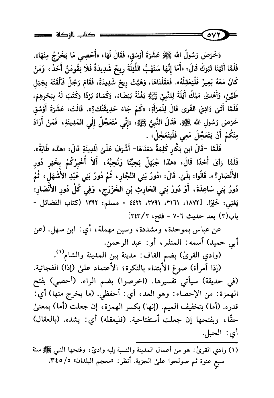 وَخَرَصَ رَسُولُ اللَّهِ صَلَّى اللهُ عَلَيْهِ وَسَلَّمَ عَشَرَةَ أَوْسُقٍ، فَقَال لَهَا: "أَحْصِي مَا يَخْرُجُ مِنْهَا" فَلَمَّا أَتَيْنَا تَبُوكَ قَال: "أَمَا إِنَّهَا سَتَهُبُّ اللَّيْلَةَ رِيحٌ شَدِيدَةٌ، فَلَا يَقُومَنَّ أَحَدٌ، وَمَنْ كَانَ مَعَهُ بَعِيرٌ فَلْيَعْقِلْهُ" فَعَقَلْنَاهَا، وَهَبَّتْ رِيحٌ شَدِيدَةٌ، فَقَامَ رَجُلٌ، فَأَلْقَتْهُ بِجَبَلِ طَيِّءٍ، وَأَهْدَى مَلِكُ أَيْلَةَ لِلنَّبِيِّ صَلَّى اللهُ عَلَيْهِ وَسَلَّمَ، بَغْلَةً بَيْضَاءَ، وَكَسَاهُ بُرْدًا وَكَتَبَ لَهُ بِبَحْرِهِمْ، فَلَمَّا أَتَى وَادِيَ القُرَى قَال لِلْمَرْأَةِ: "كَمْ جَاءَ حَدِيقَتُكِ" قَالتْ: عَشَرَةَ أَوْسُقٍ، خَرْصَ رَسُولِ اللَّهِ صَلَّى اللهُ عَلَيْهِ وَسَلَّمَ، فَقَال النَّبِيُّ صَلَّى اللهُ عَلَيْهِ وَسَلَّمَ: "إِنِّي مُتَعَجِّلٌ إِلَى المَدِينَةِ، فَمَنْ أَرَادَ مِنْكُمْ أَنْ يَتَعَجَّلَ مَعِي، فَلْيَتَعَجَّلْ" فَلَمَّا قَال ابْنُ بَكَّارٍ كَلِمَةً مَعْنَاهَا: أَشْرَفَ عَلَى المَدِينَةِ قَال: "هَذِهِ طَابَةُ" فَلَمَّا رَأَى أُحُدًا قَال: "هَذَا جُبَيْلٌ يُحِبُّنَا وَنُحِبُّهُ، أَلا أُخْبِرُكُمْ بِخَيْرِ دُورِ الأَنْصَارِ" قَالُوا: بَلَى، قَال: "دُورُ بَنِي النَّجَّارِ، ثُمَّ دُورُ بَنِي عَبْدِ الأَشْهَلِ، ثُمَّ دُورُ بَنِي سَاعِدَةَ - أَوْ دُورُ بَنِي الحَارِثِ بْنِ الخَزْرَجِ - وَفِي كُلِّ دُورِ الأَنْصَارِ - يَعْنِي - خَيْرًا".