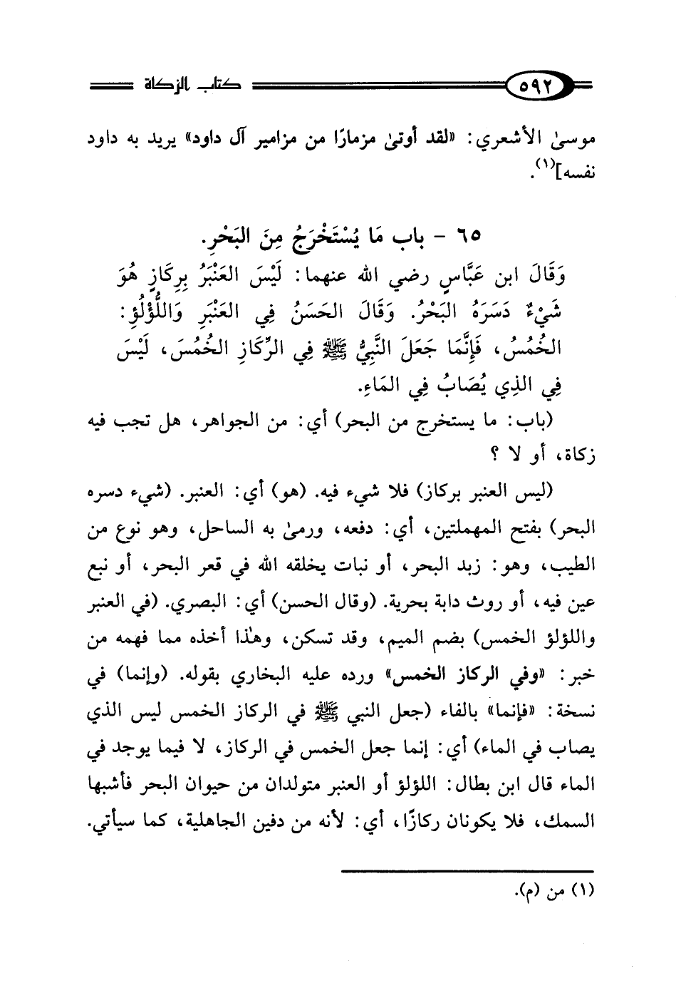 وَقَال ابْنُ عَبَّاسٍ رَضِيَ اللَّهُ عَنْهُمَا: "لَيْسَ العَنْبَرُ بِرِكَازٍ هُوَ شَيْءٌ دَسَرَهُ البَحْرُ" وَقَال الحَسَنُ فِي العَنْبَرِ وَاللُّؤْلُؤِ: "الخُمُسُ" فَإِنَّمَا جَعَلَ النَّبِيُّ صَلَّى اللهُ عَلَيْهِ وَسَلَّمَ "فِي الرِّكَازِ الخُمُسَ" لَيْسَ فِي الَّذِي يُصَابُ فِي المَاءِ".