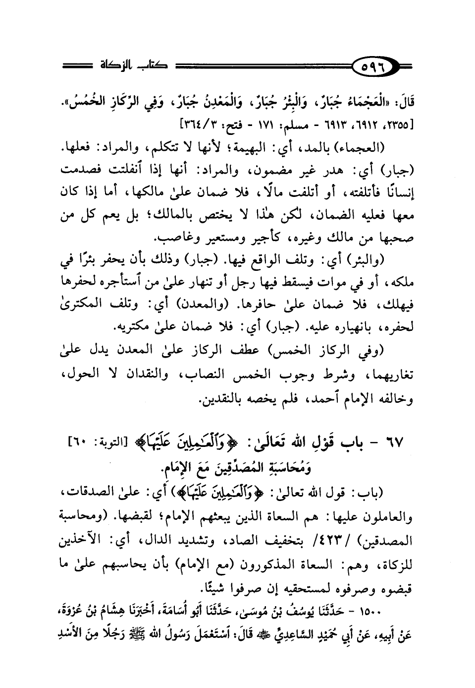 (باب: قول الله تعالى: ({وَالْعَامِلِينَ عَلَيْهَا}) أي: على الصدقات، والعاملون عليها: هم السعاة الذين يبعثهم الإمام؛ لقبضها. (ومحاسبة المصدقين) بتخفيف الصاد، وتشديد الدال، أي: الآخذين للزكاة، وهم: السعاة المذكورون (مع الإمام) بأن يحاسبهم على ما قبضوه وصرفوه لمستحقيه إن صرفوا شيئًا.