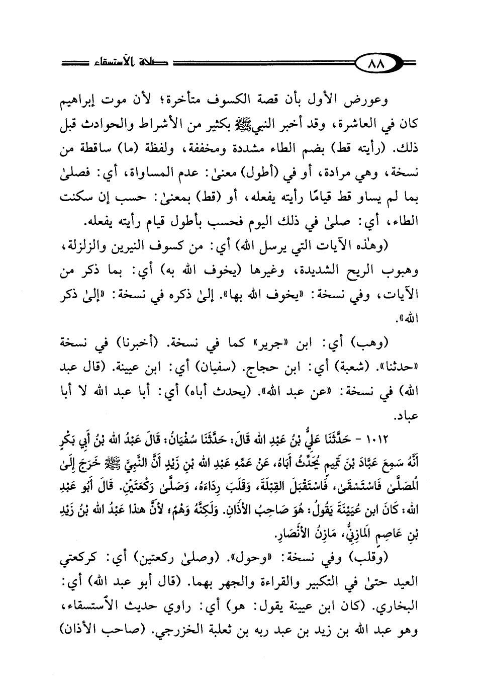 1012 - حَدَّثَنَا عَلِيُّ بْنُ عَبْدِ اللَّهِ، قَال: حَدَّثَنَا سُفْيَانُ، عَنْ عَبْدِ اللَّهِ بْنِ أَبِي بَكْرٍ، أَنَّهُ سَمِعَ عَبَّادَ بْنَ تَمِيمٍ، يُحَدِّثُ أَبَاهُ، عَنْ عَمِّهِ عَبْدِ اللَّهِ بْنِ زَيْدٍ، "أَنَّ النَّبِيَّ صَلَّى اللهُ عَلَيْهِ وَسَلَّمَ خَرَجَ إِلَى المُصَلَّى فَاسْتَسْقَى فَاسْتَقْبَلَ القِبْلَةَ، وَقَلَبَ رِدَاءَهُ، وَصَلَّى رَكْعَتَيْنِ" قَال أَبُو عَبْدِ اللَّهِ: "كَانَ ابْنُ عُيَيْنَةَ يَقُولُ: هُوَ صَاحِبُ الأَذَانِ، وَلَكِنَّهُ وَهْمٌ لِأَنَّ هَذَا عَبْدُ اللَّهِ بْنُ زَيْدِ بْنِ عَاصِمٍ المَازِنِيُّ مَازِنُ الأَنْصَارِ".