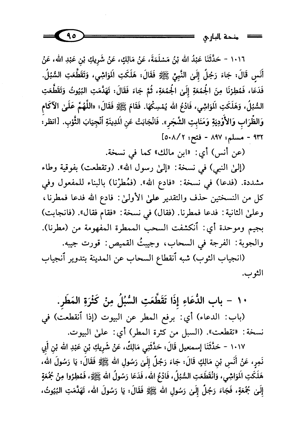 1017 - حَدَّثَنَا إِسْمَاعِيلُ، قَال: حَدَّثَنِي مَالِكٌ، عَنْ شَرِيكِ بْنِ عَبْدِ اللَّهِ بْنِ أَبِي نَمِرٍ، عَنْ أَنَسِ بْنِ مَالِكٍ، قَال: جَاءَ رَجُلٌ إِلَى رَسُولِ اللَّهِ صَلَّى اللهُ عَلَيْهِ وَسَلَّمَ، فَقَال: يَا رَسُولَ اللَّهِ هَلَكَتِ المَوَاشِي، وَانْقَطَعَتِ السُّبُلُ، فَادْعُ اللَّهَ فَدَعَا رَسُولُ اللَّهِ صَلَّى اللهُ عَلَيْهِ وَسَلَّمَ، فَمُطِرُوا مِنْ جُمُعَةٍ إِلَى جُمُعَةٍ، فَجَاءَ رَجُلٌ إِلَى رَسُولِ اللَّهِ صَلَّى اللهُ عَلَيْهِ وَسَلَّمَ، فَقَال: يَا رَسُولَ اللَّهِ تَهَدَّمَتِ البُيُوتُ