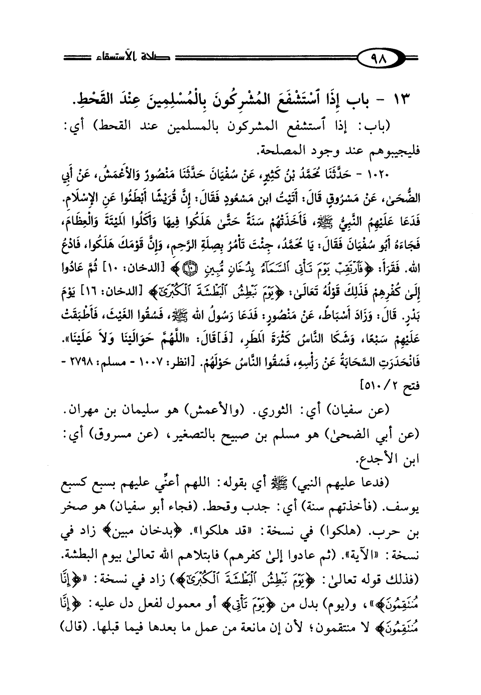1020 - حَدَّثَنَا مُحَمَّدُ بْنُ كَثِيرٍ، عَنْ سُفْيَانَ، حَدَّثَنَا مَنْصُورٌ، وَالأَعْمَشُ، عَنْ أَبِي الضُّحَى، عَنْ مَسْرُوقٍ، قَال: أَتَيْتُ ابْنَ مَسْعُودٍ، فَقَال: إِنَّ قُرَيْشًا أَبْطَئُوا عَنِ الإِسْلامِ، "فَدَعَا عَلَيْهِمُ النَّبِيُّ صَلَّى اللهُ عَلَيْهِ وَسَلَّمَ، فَأَخَذَتْهُمْ سَنَةٌ حَتَّى هَلَكُوا فِيهَا، وَأَكَلُوا المَيْتَةَ وَالعِظَامَ"، فَجَاءَهُ أَبُو سُفْيَانَ، فَقَال: يَا مُحَمَّدُ جِئْتَ تَأْمُرُ بِصِلَةِ الرَّحِمِ وَإِنَّ قَوْمَكَ هَلَكُوا، فَادْعُ اللَّهَ، فَقَرَأَ: {فَارْتَقِبْ يَوْمَ تَأْتِي السَّمَاءُ بِدُخَانٍ مُبِينٍ} [الدخان: 10] ثُمَّ عَادُوا إِلَى كُفْرِهِمْ، فَذَلِكَ قَوْلُهُ تَعَالى: {يَوْمَ نَبْطِشُ البَطْشَةَ الكُبْرَى إِنَّا مُنْتَقِمُونَ} [الدخان: 16] يَوْمَ بَدْرٍ قَال أَبُو عَبْدِ اللَّهِ: وَزَادَ أَسْبَاطٌ، عَنْ مَنْصُورٍ، فَدَعَا رَسُولُ اللَّهِ صَلَّى اللهُ عَلَيْهِ وَسَلَّمَ، فَسُقُوا الغَيْثَ، فَأَطْبَقَتْ عَلَيْهِمْ سَبْعًا، وَشَكَا النَّاسُ كَثْرَةَ المَطَرِ، قَال: "اللَّهُمَّ حَوَاليْنَا وَلَا عَلَيْنَا" فَانْحَدَرَتِ السَّحَابَةُ عَنْ رَأْسِهِ، فَسُقُوا النَّاسُ حَوْلَهُمْ.