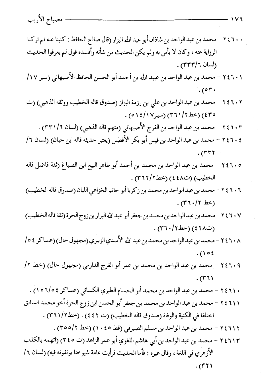 24605 - محمد بن عبد الواحد بن محمد بن أحمد أبو طاهر البيع ابن الصباغ (ثقة فاضل قاله الخطيب) (ت 448) (خط 2/ 362).