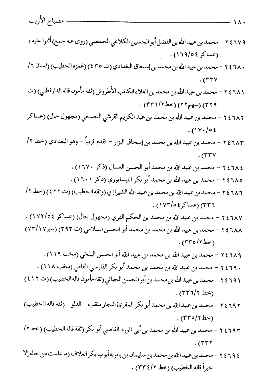 24694 - محمد بن عبيد الله بن محمد بن سليمان بن بابويه أبو بكر العلاف (ما علمت من حاله إلا خيرًا قاله الخطيب) (خط 2/ 334).