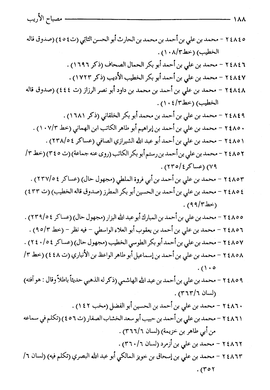 24854 - محمد بن علي بن أحمد بن الحسين أبو بكر المطرز (صدوق قاله الخطيب) (ت 433) (خط 3/ 99).