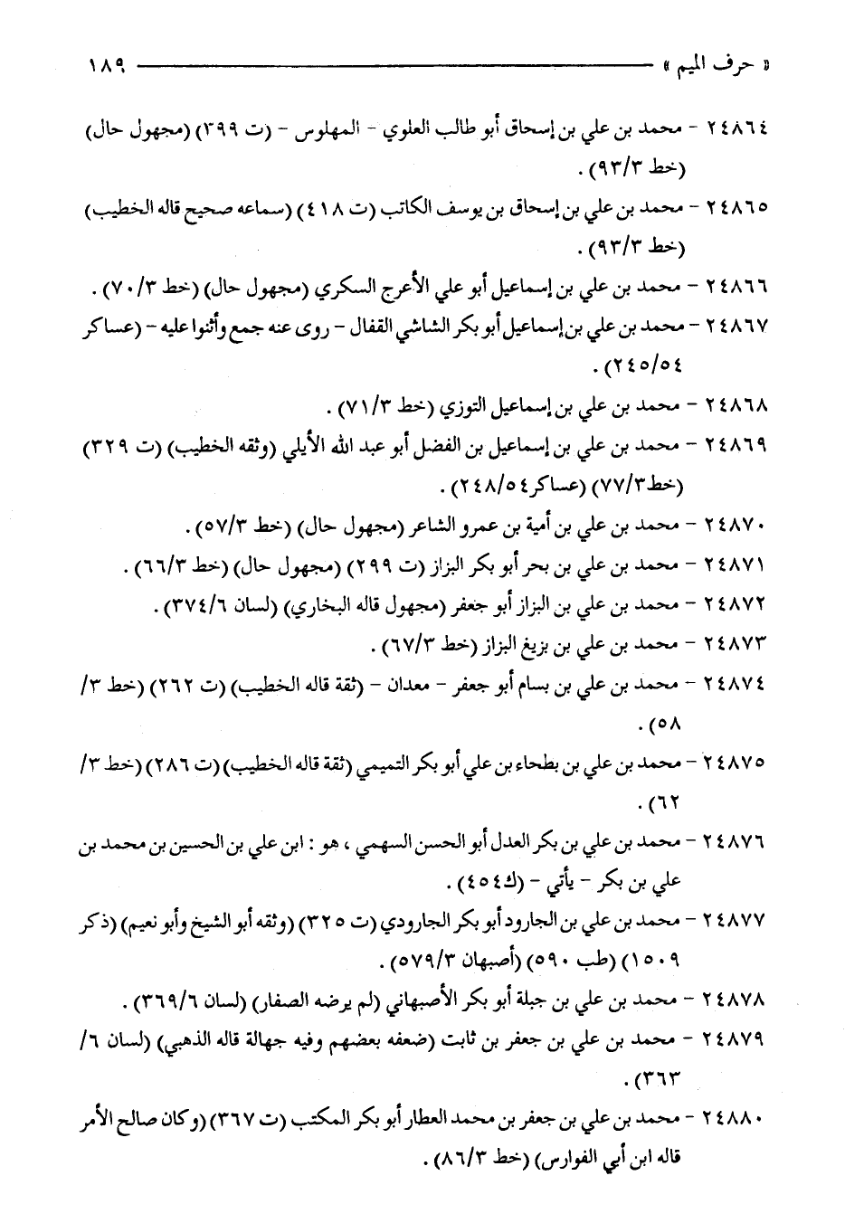 24875 - محمد بن علي بن بطحاء بن علي أبو بكر التميمي (ثقة قاله الخطيب) (ت 286) (خط 3/ 62).