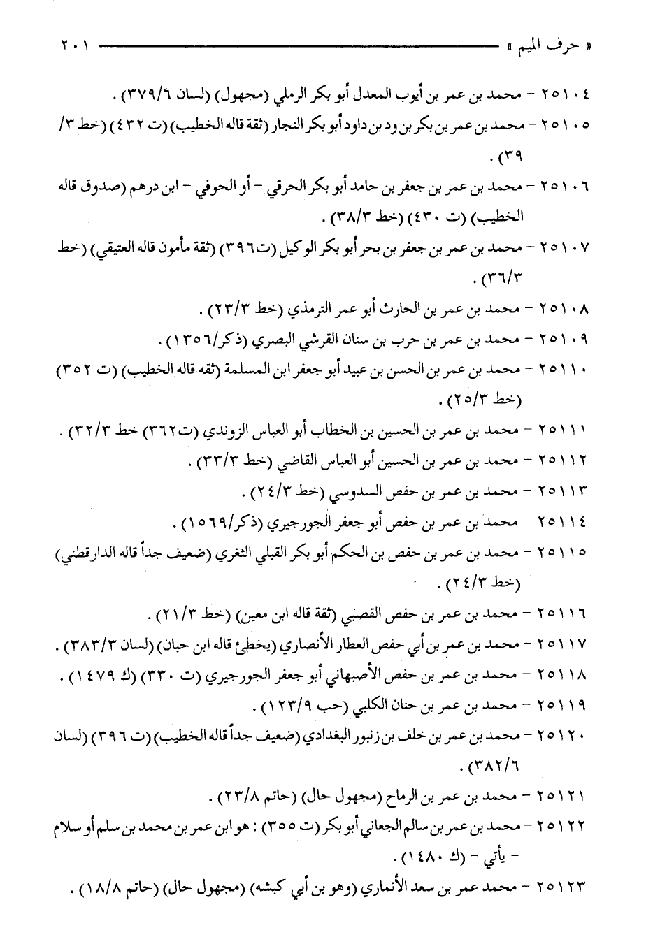 25120 - محمد بن عمر بن خلف بن زنبور البغدادي (ضعيف جدًّا قاله الخطيب) (ت 396) (لسان 6/ 382).