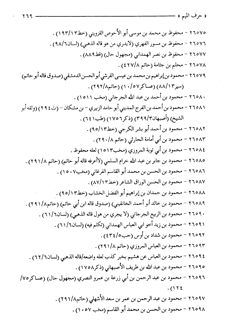 26585 - محمود بن جابر بن عبد الله خرام السلمي (لا أعرفه قاله أبو حاتم) (حاتم 8/ 291).