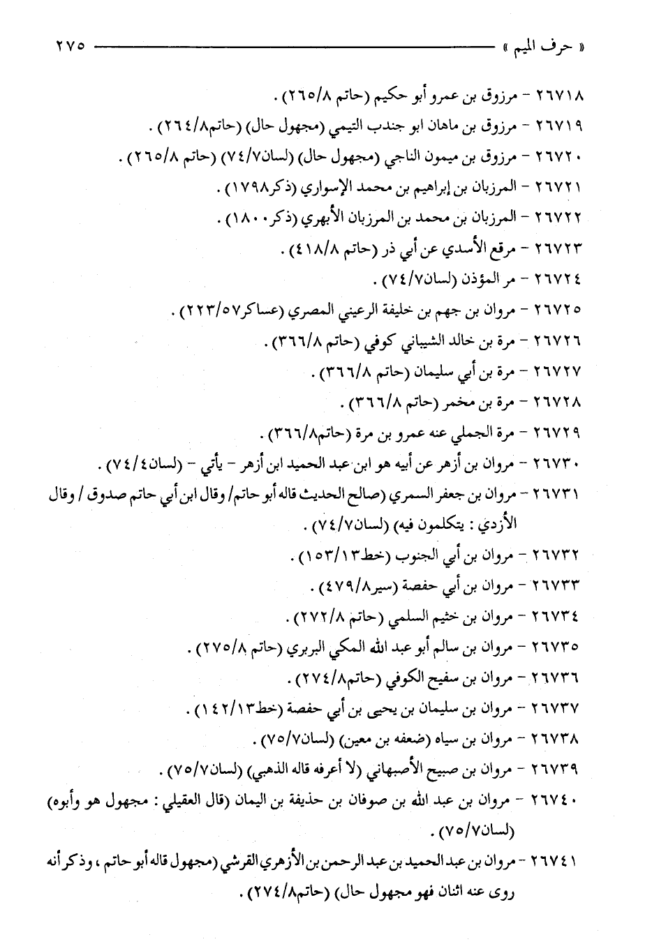 26741 - مروان بن عبد الحميد بن عبد الرحمن بن الأزهري القرشي (مجهول قاله أبو حاتم، وذكر أنه روى عنه اثنان فهو مجهول حال) (حاتم 8/ 274).