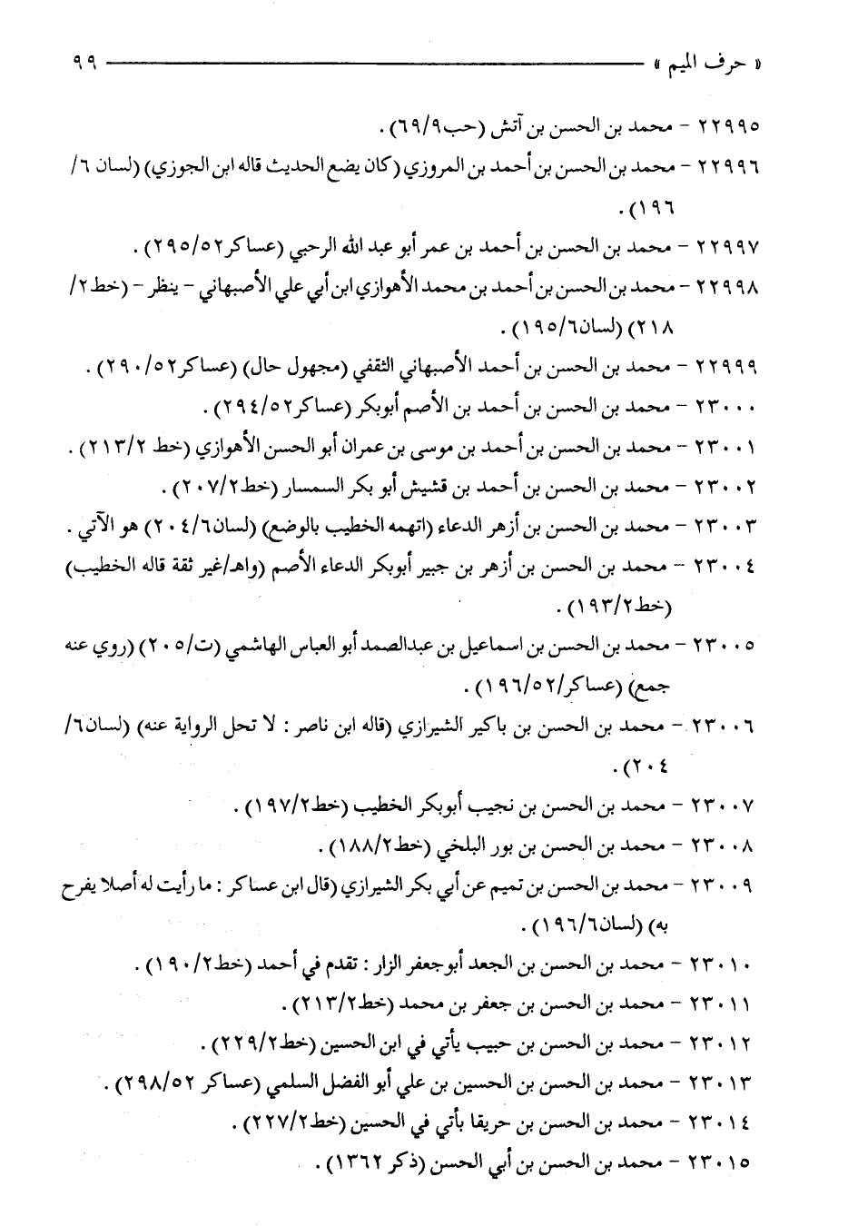 23009 - محمد بن الحسن بن تميم عن أبي بكر الشيرازي (قال ابن عساكر: ما رأيت له أصلًا يفرح به) (لسان 6/ 196).