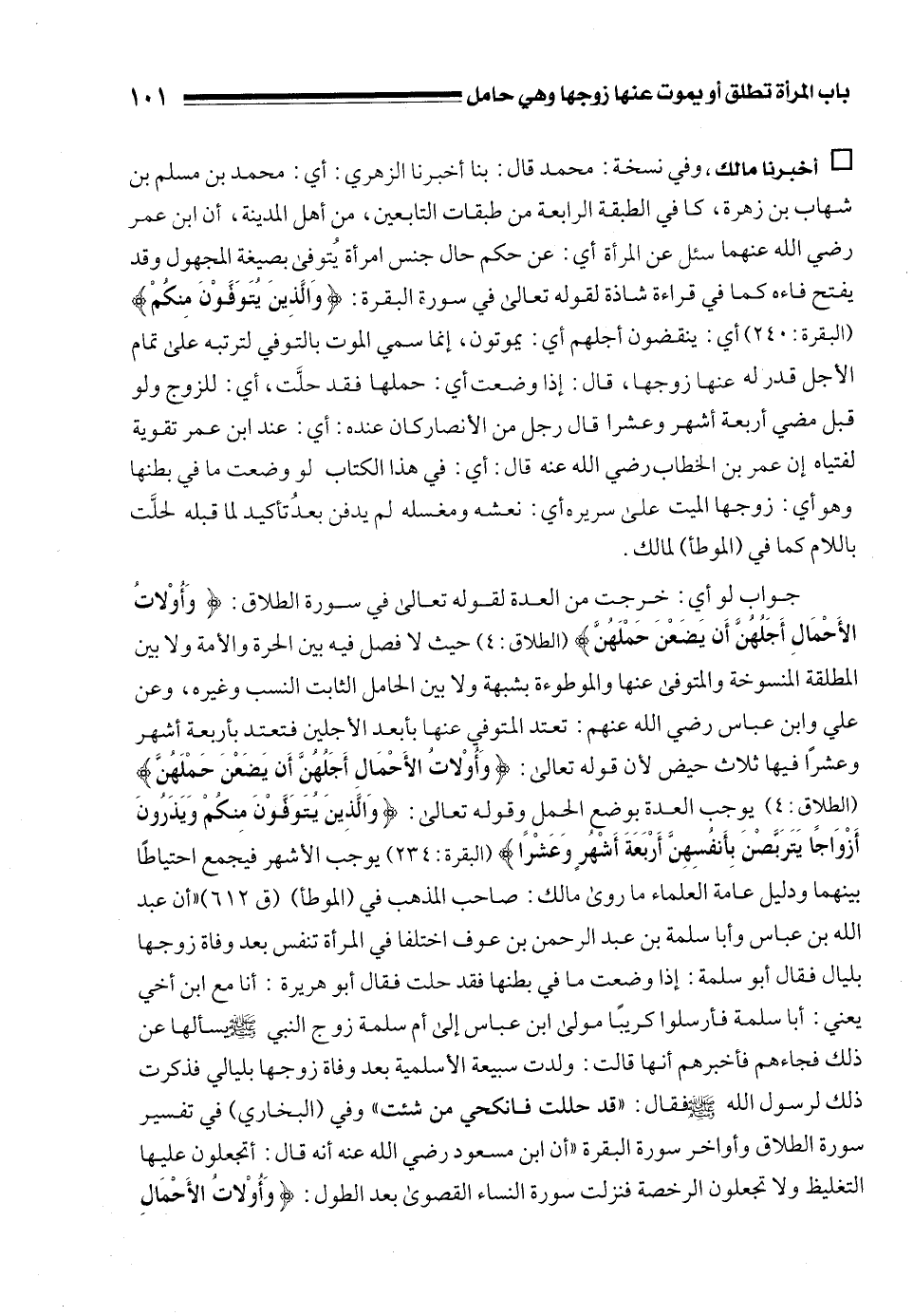 • أخبرنا مالك، وفي نسخة: محمد قال: بنا أخبرنا الزهري: أي: محمد بن مسلم بن شهاب بن زهرة، كان في الطبقة الرابعة من طبقات التابعين، من أهل المدينة، أن ابن عمر رضي الله عنهما سئل عن المرأة أي: عن حكم حال جنس امرأة يُتوفى بصيغة المجهول وقد يفتح فاءه كما في قراءة شاذة لقوله تعالى في سوره البقرة: {وَالَّذِينَ يُتَوَفَّوْنَ مِنكُمْ} [البقرة: 240] أي: ينقضون أجلهم أي: يموتون، إنما سمي الموت بالتوفي لترتبه على تمام الأجل قدر له عنها زوجها، قال: إذا وضعت أي: حملها فقد حلَّت، أي: للزوج ولو قبل مضي أربعة أشهر وعشرا قال رجل من الأنصار كان عنده: أي: عند ابن عمر تقوية لفتياه إن عمر بن الخطاب رضي الله عنه قال: أي: في هذا الكتاب لو وضعت ما في بطنها وهو أي: زوجها الميت على سريره أي: نعشه ومغسله لم يدفن بعدُ تأكيد لما قبله لحلَّت باللام كما في (الموطأ) لمالك.