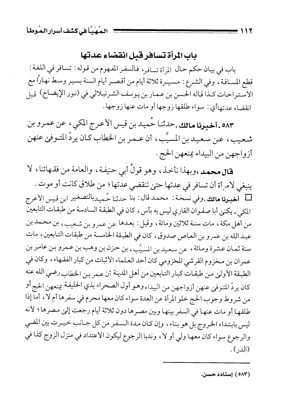 • أخبرنا مالك, وفي نسخة: محمد قال: بنا حدثنا حُميد بالتصغير ابن قيس الأعرج المكي، يكنى أبا صفوان القاري ليس به بأس، كان في الطبقة السادسة من طبقات التابعين من أهل مكة، مات سنة ثلاثين ومائة، وقيل: بعدها عن عمرو بن شعيب، بن محمد بن عبد الله بن عمرو بن العاص صدوق، كان في الطبقة الخامسة من طبقات التابعين، مات سنة ثمان عشرة ومائة، عن سعيد بن المسيَّب، بن حزن بن وهب بن عمرو بن عامر بن عمران بن مخزوم القرشي المخزومي كان أحد العلماء الأثبات من كبار الفقهاء، وكان في الطبقة الأولى من طبقات كبار التابعين من أهل المدينة أن عمر بن الخطاب رضي الله عنه كان يردّ المتوفى عنهن أزواجهن من البيداء وهو أول الصحراء بذي الحليفة يمنعهن الحج أو من شروط وجوب الحج خلو المرأة عن العدة سواء كان معها محرم في سفرها أم لا، أما إذا طلقها أو مات عنها في السفر بينها وبين مصرها دون ثلاثة أيام رجعت إلى مصرها؛ لأنه ليس بابتداء الخروج بل هو بناء، وإن كان مدة السفر من كل جانب خيرت بين المضي والرجوع سواء كان معها ولي أو لا، وندبا الرجوع ليكون الاعتداد في منزل الزوج كذا في (الدر).