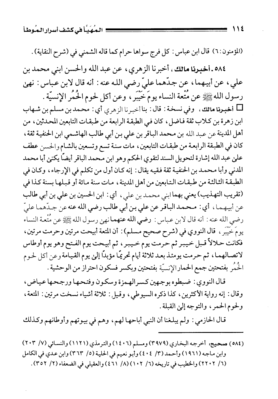 • أخبرنا مالك، وفي نسخة: قال: بنا أخبرنا الزهري أي: محمد بن مسلم بن شهاب بن زهرة بن كلاب ثقة فاضل، كان في الطبقة الرابعة من طبقات التابعين المحدثين، من أهل المدينة عن عبد الله بن محمد الباقر بن علي بن أبي طالب الهاشمي ابن الحنفية ثقة، كان في الطبقة الرابعة من طبقات التابعين، مات سنة تسع وتسعين بالشام والحسن عطف على عبد الله إشارة لتحويل السند لتقوي الحكم وهو ابن محمد الباقر أيضًا يكنى أبا محمد المدني وأبا محمد بن الحنفية ثقة فقيه يقال: إنه كان أول من تكلم في الإِرجاء، وكان في الطبقة الثالثة من طبقات التابعين من أهل المدينة، مات سنة مائة أو قبلها بسنة كذا في (تقريب التهذيب) يعني بهما ابني محمد بن علي، أي: ابن الحسين بن علي بن أبي طالب عن أبيهما، أي: محمد الباقر عن علي بن أبي طالب رضي الله عنه عن جدّهما عليّ رضي الله عنه: أنه قال لابن عباس رضي الله عنهما: نهى رسول الله - صلى الله عليه وسلم - عن مُتْعة النساء يومَ خَيْبَر، قال النووي في (شرح صحيح مسلم): أن المتعة أبيحت مرتين وحرمت مرتين، فكانت حلالًا قبل خيبر ثم حرمت يوم خيبر، ثم أبيحت يوم الفتح وهو يوم أوطاس لاتصالهما، ثم حرمت يومئذ بعد ثلاثة أيام تحريمًا مؤبدًا إلى يوم القيامة وعن أكل لحوم الحُمُر بفتحتين جمع الحمار الإِنسيّة بفتحتين وبكسر فسكون احتراز من الوحشية.