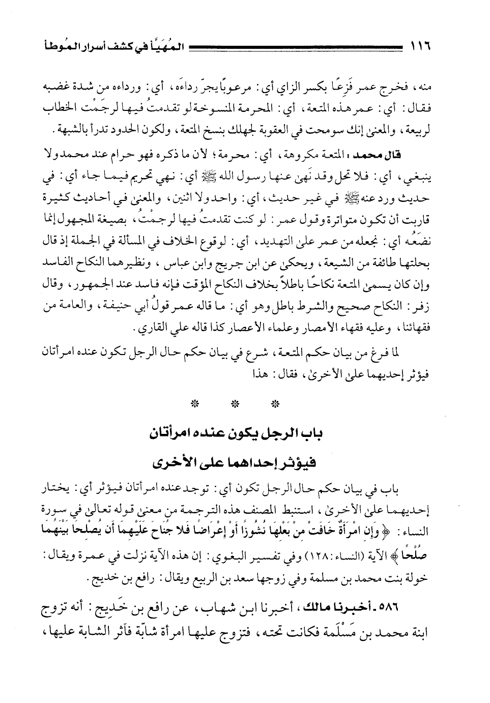 586 - أخبرنا مالك, أخبرنا ابن شهاب، عن رافع بن خَدِيج: أنه تزوج ابنة محمد بن مَسْلَمة فكانت تحته، فتزوج عليها امرأة شابّة فآثر الشابة عليها،