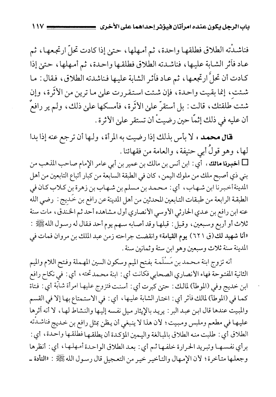 أنه تزوج ابنة محمد بن مَسْلَمة بفتح الميم وسكون السين المهملة وفتح اللام والميم الثانية المفتوحة فهاء الأنصاري الصحابي فكانت أي: ابنة محمد تحته، أي: في نكاح رافع بن خديج وفي (الموطأ) لمالك: حتى كبرت أي: أسنت فتزوج عليها امرأة شابّة أي: فتاة كما في (الموطأ) لمالك فآثر أي: اختار الشابة عليها، أي: في الاستمتاع بها إلا في القسم والمبيت عندها قال ابن عبد البر: يريد بالإِيثار ميل نفسه إليها والنشاط لها، لا أنه آثرها عليها في مطعم وملبس ومبيت؛ لأن هذا لا ينبغي أن يظن بمثل رافع بن خديج فناشدته الطلاق أي: طلبت منه الطلاق بالمبالغة واليمين المؤكدة أن يطلقها فطلقها واحدة, أي: برأي نفسها وتبريد الحرارة خلفها ثم أي: بعد الطلاق الواحدة أمهلها، أي: أنظرها وجعلها متأخرة؛ لأن الإِمهال والتأخير خير من التعجيل قال رسول الله - صلى الله عليه وسلم -: "التأدة -