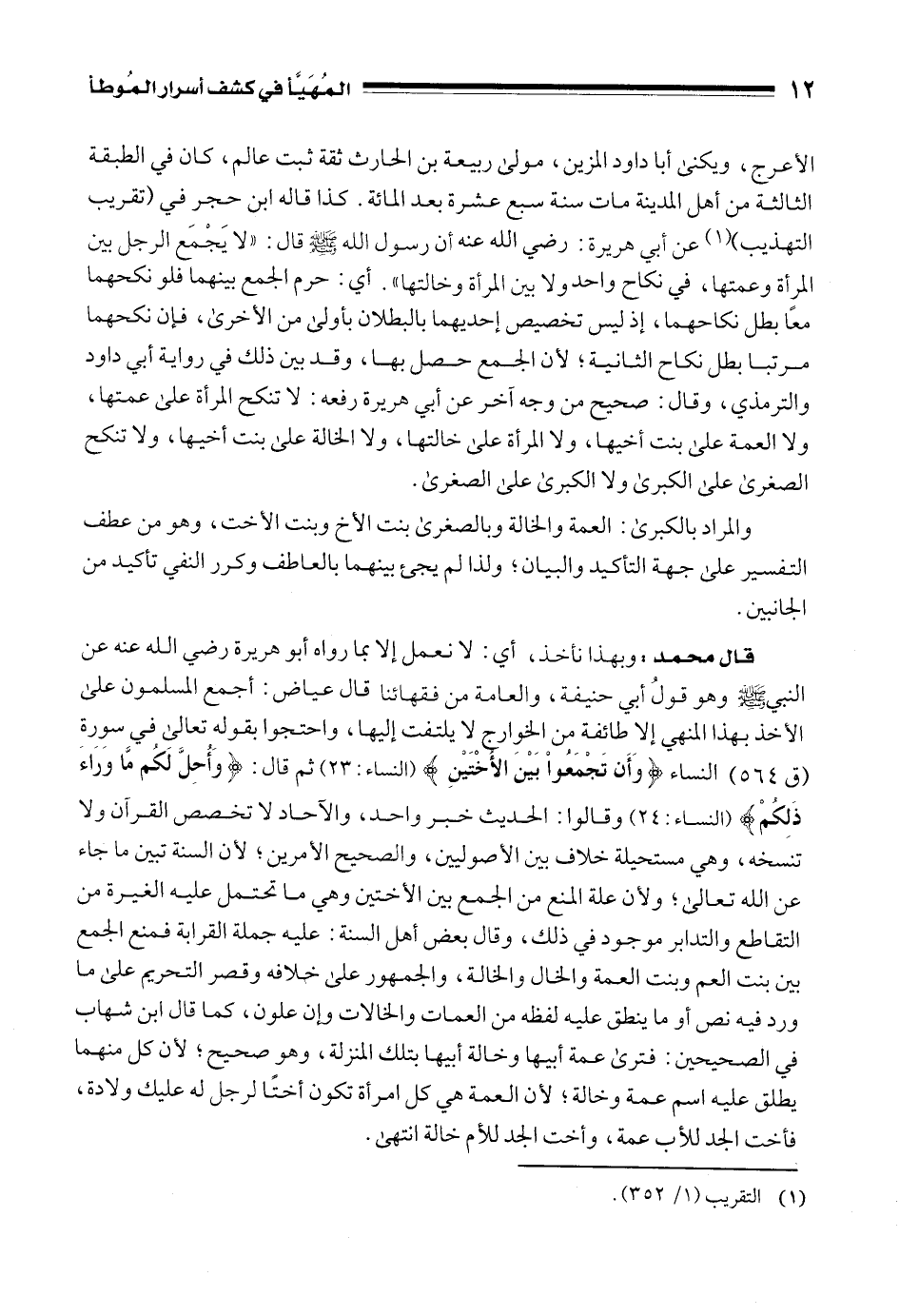 قال محمد: وبهذا نأخذ، أي: لا نعمل إلا بما رواه أبو هريرة رضي الله عنه عن النبي - صلى الله عليه وسلم - وهو قولُ أبي حنيفة، والعامة من فقهائنا قال عياض: أجمع المسلمون على الأخذ بهذا المنهي إلا طائفة من الخوارج لا يلتفت إليها، واحتجوا بقوله تعالى في سورة (ق 564) النساء {وَأَنْ تَجْمَعُوا بَيْنَ الْأُخْتَيْنِ} [النساء: 23] ثم قال: {وَأُحِلَّ لَكُمْ مَا وَرَاءَ ذَلِكُمْ} [النساء: 24] وقالوا: الحديث خبر واحد، والآحاد لا تخصص القرآن ولا تنسخه، وهي مستحيلة خلاف بين الأصوليين، والصحيح الأمرين؛ لأن السنة تبين ما جاء عن الله تعالى؛ ولأن علة المنع من الجمع بين الأختين وهي ما تحتمل عليه الغيرة من التقاطع والتدابر موجود في ذلك، وقال بعض أهل السنة: عليه جملة القرابة فمنع الجمع بين بنت العم وبنت العمة والخال والخالة، والجمهور على خلافه وقصر التحريم على ما ورد فيه نص أو ما ينطق عليه لفظه من العمات والخالات وإن علون، كما قال ابن شهاب في الصحيحين: فترى عمة أبيها وخالة أبيها بتلك المنزلة، وهو صحيح؛ لأن كل منهما يطلق عليه اسم عمة وخالة؛ لأن العمة هي كل امرأة تكون أختًا لرجل له عليك ولادة، فأخت الجد للأب عمة، وأخت الجد للأم خالة انتهى.