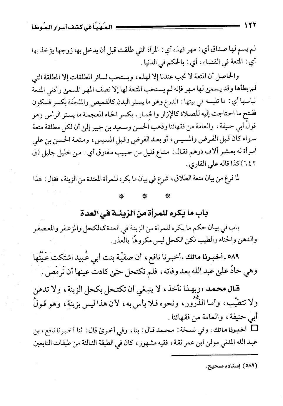 589 - أخبرنا مالك، أخبرنا نافع، أن صفيّة بنت أبي عُبيد اشتكت عَيْنُها وهي حادّ على عبد الله بعد وفاته، فلم تكتحل حتى كادت عينها أن تَرمَص.