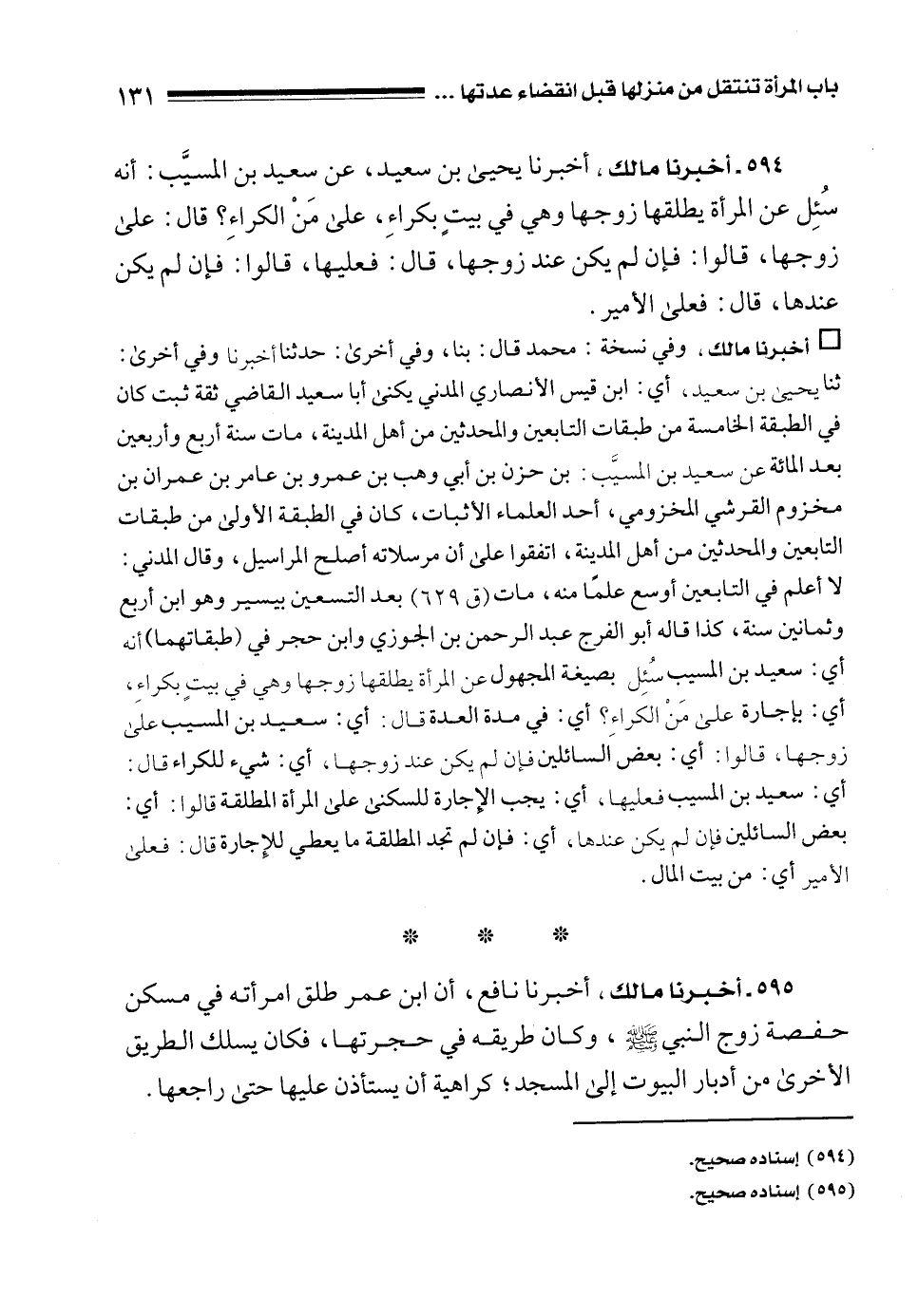 594 - أخبرنا مالك، أخبرنا يحيى بن سعيد، عن سعيد بن المسيَّب: أنه سُئِل عن المرأة يطلقها زوجها وهي في بيتٍ بكراءِ، على مَنْ الكراءِ؟ قال: على زوجها، قالوا: فإن لم يكن عند زوجها، قال: فعليها، قالوا: فإن لم يكن عندها، قال: فعلى الأمير.