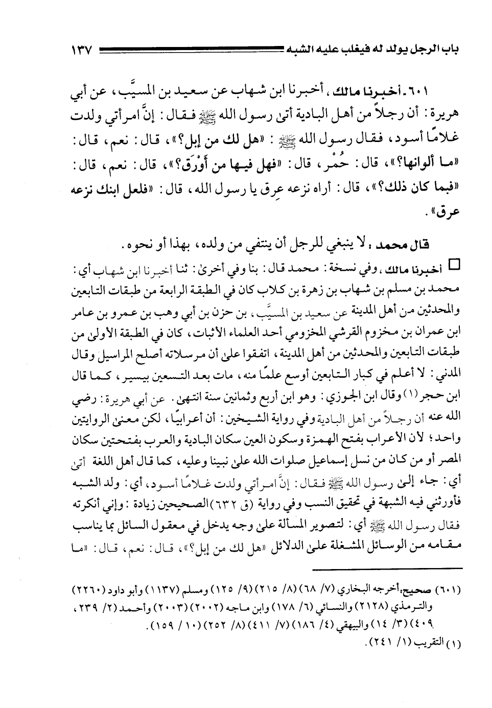 601 - أخبرنا مالك، أخبرنا ابن شهاب عن سعيد بن المسيَّب، عن أبي هريرة: أن رجلًا من أهل البادية أتى رسول الله - صلى الله عليه وسلم - فقال: إنَّ امرأتي ولدت غلامًا أسود، فقال رسول الله - صلى الله عليه وسلم -: "هل لك من إبل؟ "، قال: نعم، قال: "ما ألوانها؟ "، قال: حُمْر، قال: "فهل فيها من أَوْرَق؟ "، قال: نعم، قال: "فبما كان ذلك؟ "، قال: أراه نزعه عِرق يا رسول الله، قال: "فلعل ابنك نزعه عرق".