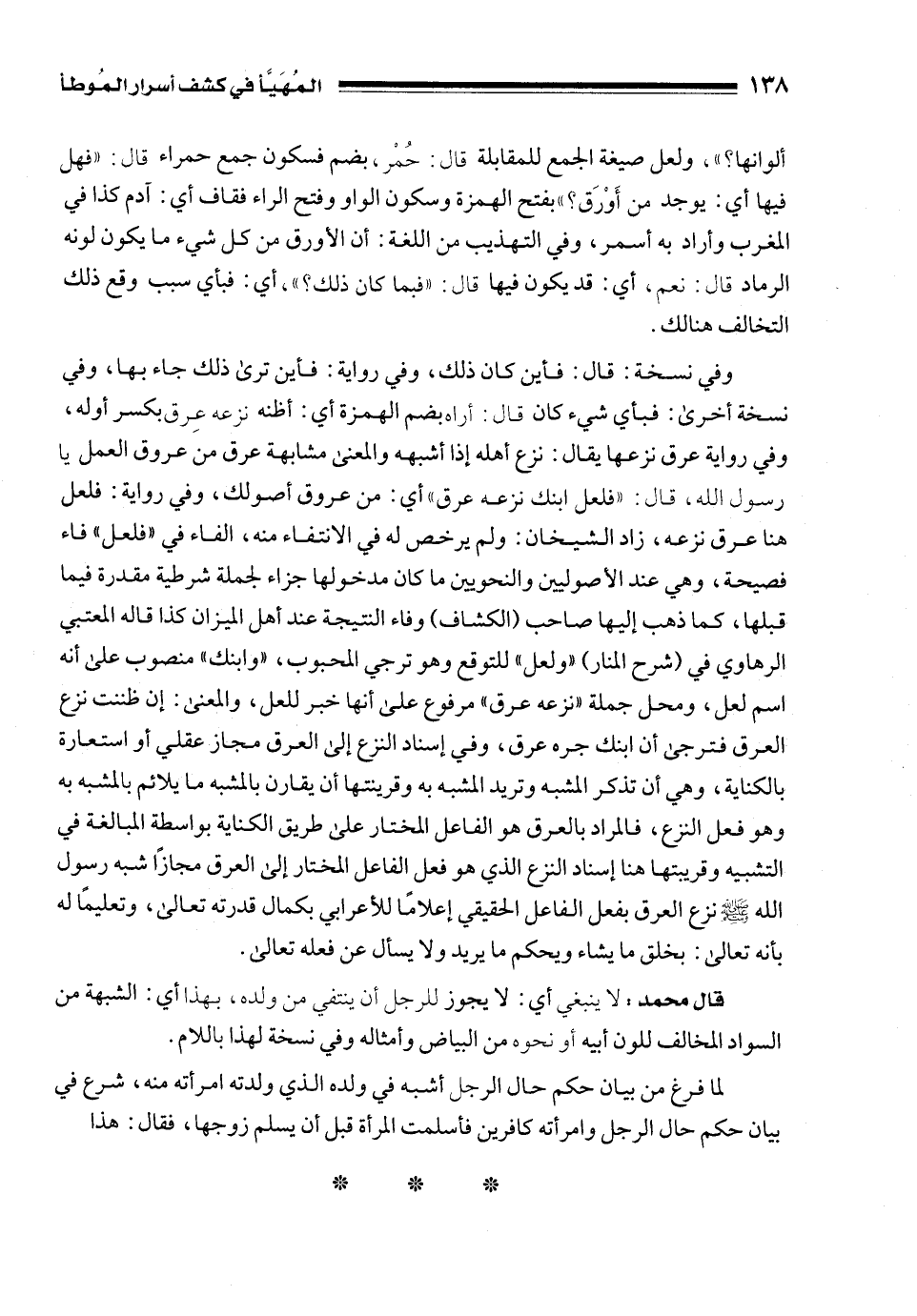 قال محمد: لا ينبغي أي: لا يجوز للرجل أن ينتفي من ولده، بهذا أي: الشبهة من السواد المخالف للون أبيه أو نحوه من البياض وأمثاله وفي نسخة لهذا باللام.