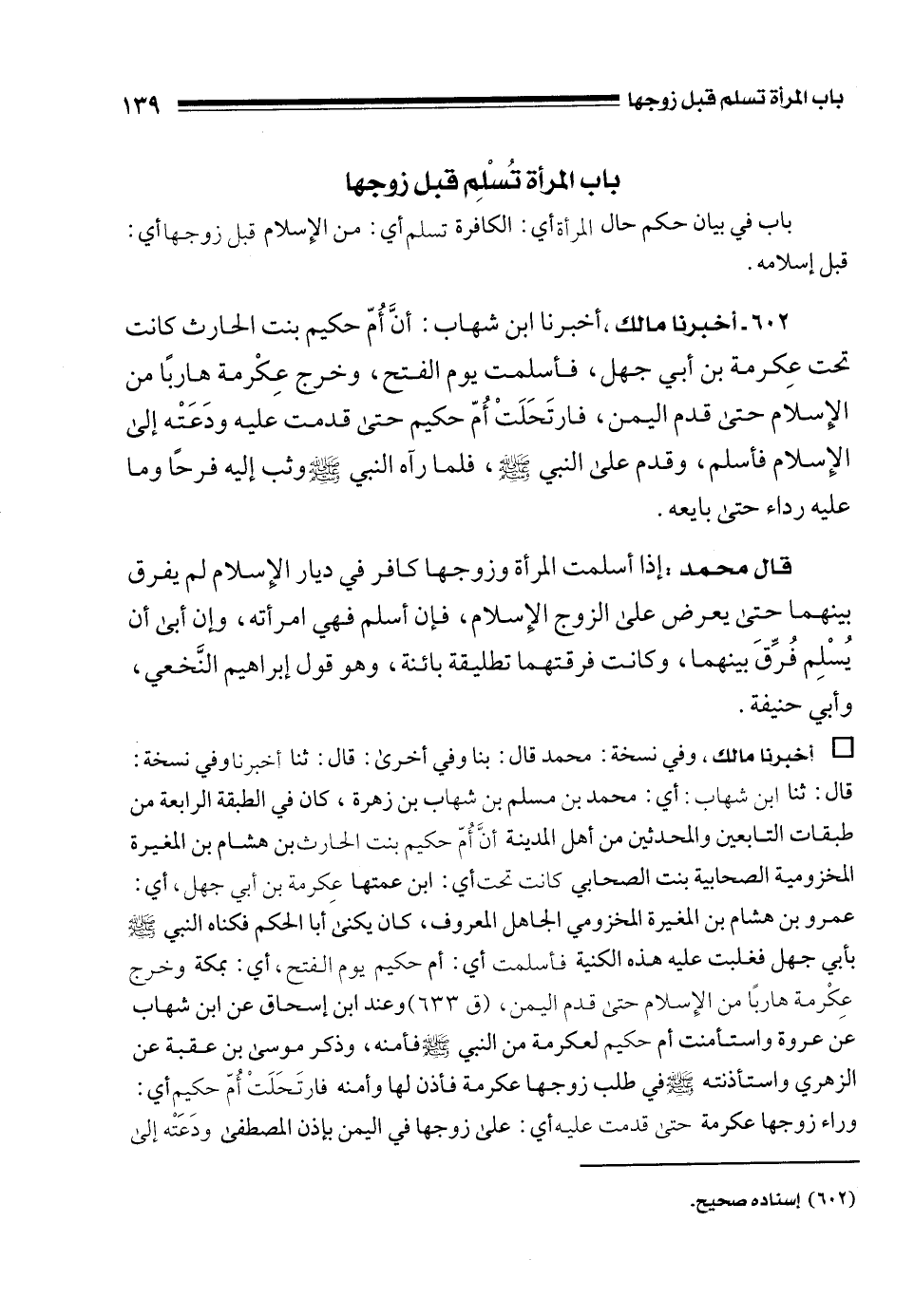 • أخبرنا مالك، وفي نسخة: محمد قال: بنا وفي أخرى: قال: ثنا أخبرنا وفي نسخة: قال: ثنا ابن شهاب: أي: محمد بن مسلم بن شهاب بن زهرة، كان في الطبقة الرابعة من طبقات التابعين والمحدثين من أهل المدينة أنَّ أُمّ حكيم بنت الحارث بن هشام بن المغيرة المخزومية الصحابية بنت الصحابي كانت تحت أي: ابن عمتها عِكرمة بن أبي جهل، أي: عمرو بن هشام بن المغيرة المخزومي الجاهل المعروف، كان يكنى أبا الحكم فكناه النبي - صلى الله عليه وسلم - بأبي جهل فغلبت عليه هذه الكنية فأسلمت أي: أم حكيم يوم الفتح، أي: بمكة وخرج عِكْرمة هاربًا من الإِسلام حتى قدم اليمن، (ق 633) وعند ابن إسحاق عن ابن شهاب عن عروة واستأمنت أم حكيم لعكرمة من النبي - صلى الله عليه وسلم - فأمنه، وذكر موسى بن عقبة عن الزهري واستأذنته - صلى الله عليه وسلم - في طلب زوجها عكرمة فأذن لها وأمنه فارتَحَلَتْ أُمّ حكيم أي: وراء زوجها عكرمة حتى قدمت عليه أي: على زوجها في اليمن بإذن المصطفى ودَعَتْه إلى