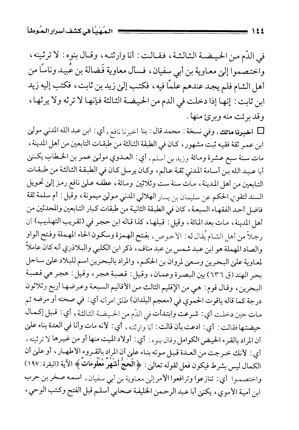 • أخبرنا مالك، وفي نسخة: محمد قال: بنا أخبرنا نافع، أي: ابن عبد الله المدني مولى ابن عمر ثقة فقيه ثبت مشهور، كان في الطبقة الثالثة من طبقات التابعين من أهل المدينة، مات سنة سبع عشرة ومائة وزيد بن أسلم، أي: العدوي مولى عمر بن الخطاب يكنى أبا عبد الله بن أسامة المدني ثقة عالم، وكان يرسل كان في الطبقة الثالثة من طبقات التابعين من أهل المدينة، مات سنة ست وثلاثين ومائة، عطفه على نافع رمز إلى تحويل السند لتقوي الحكم عن سليمان بن يسار الهلالي المدني مولى ميمونة، وقيل: أم سلمة ثقة فاضل أحد الفقهاء السبعة، كان في الطبقة الثانية من طبقات كبار التابعين والمحدثين من أهل المدينة، مات بعد المائة، وقيل: قبلها، كذا قاله ابن حجر في (تقريب التهذيب) أن رجلًا من أهل الشام يُقال له: الأحوص، بفتح الهمزة وسكون الحاء المهملة وفتح الواو والصاد المهملة هو ابن عبد شمس بن عبد مناف، ذكر ابن الكلبي والبلاذري أنه كان عاملًا لمعاوية على البحرين وسعى لمروان بن الحكم، والمراد بالبحرين اسم للبلاد على ساحل بحر الهند (ق 636) بين البصرة وعمان، وقيل: قصبة هجر، وقيل: هجر هي قصبة البحرين، وقال قوم: هي من الإِقليم الثالث من الأقاليم السبعة وعرضها أربع وثلاثون درجة كما قاله ياقوت الحموي في (معجم البلدان) طلق امرأته أي: في صحته أو مرضه ثم مات حين دخلت أي: شرعت وابتدأت في الدّم من الحيضة الثالثة، أي: قبل إكمال حيضتها فقالت: أي: ادعت بأن قالت: أنا وارثته، أي: لأنه مات وأنا في العدة بناء على أن المراد بالقرء الحيض الكوامل وقال بنوه: أي: أولاد الميت منها أو من غيرها لا ترثينه، أي: لأنك خرجت من العدة قبل موته بناء على أن المراد بالقروء الأطهار، أو على أن الكمال ليس بشرط فيكون فعل لقوله تعالى: {الْحَجُّ أَشْهُرٌ مَعْلُومَاتٌ} الآية [البقرة: 197] واختصموا أي: تنازعوا وترافعوا الأمر إلى معاوية بن أبي سفيان، اسمه صخر بن حرب بن أمية الأموي، يكنى أبا عبد الرحمن الخليفة صحابي أسلم قبل الفتح وكتب الوحي،
