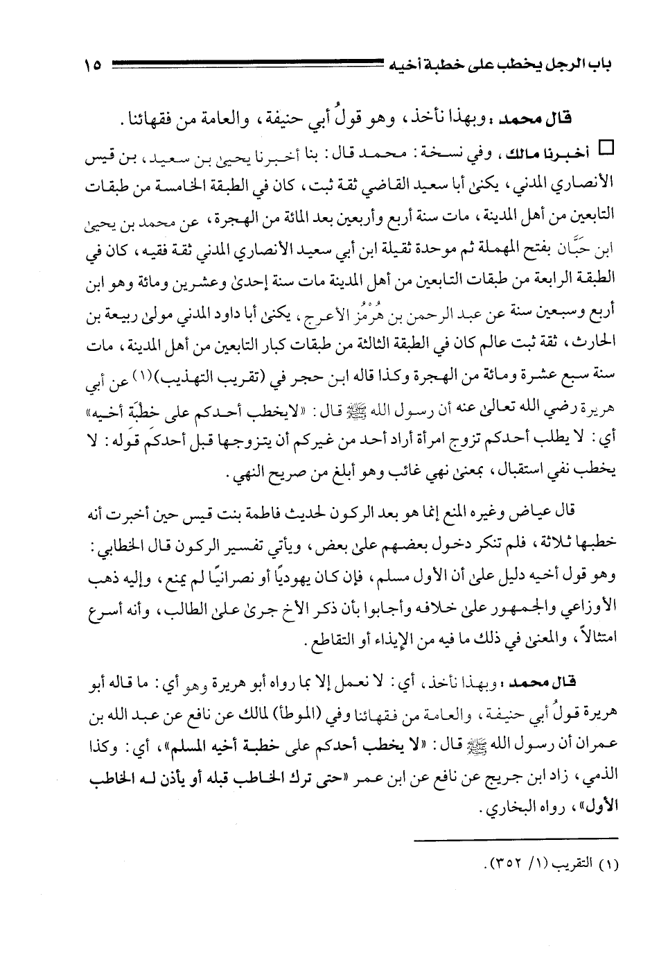 قال محمد: وبهذا نأخذ، أي: لا نعمل إلا بما رواه أبو هريرة وهو أي: ما قاله أبو هريرة قولُ أبي حنيفة، والعامة من فقهائنا وفي (الموطأ) لمالك عن نافع عن عبد الله بن عمران أن رسول الله - صلى الله عليه وسلم - قال: "لا يخطب أحدكم على خطبة أخيه المسلم"، أي: وكذا الذمي، زاد ابن جريج عن نافع عن ابن عمر "حتى ترك الخاطب قبله أو يأذن له الخاطب الأول"، رواه البخاري.