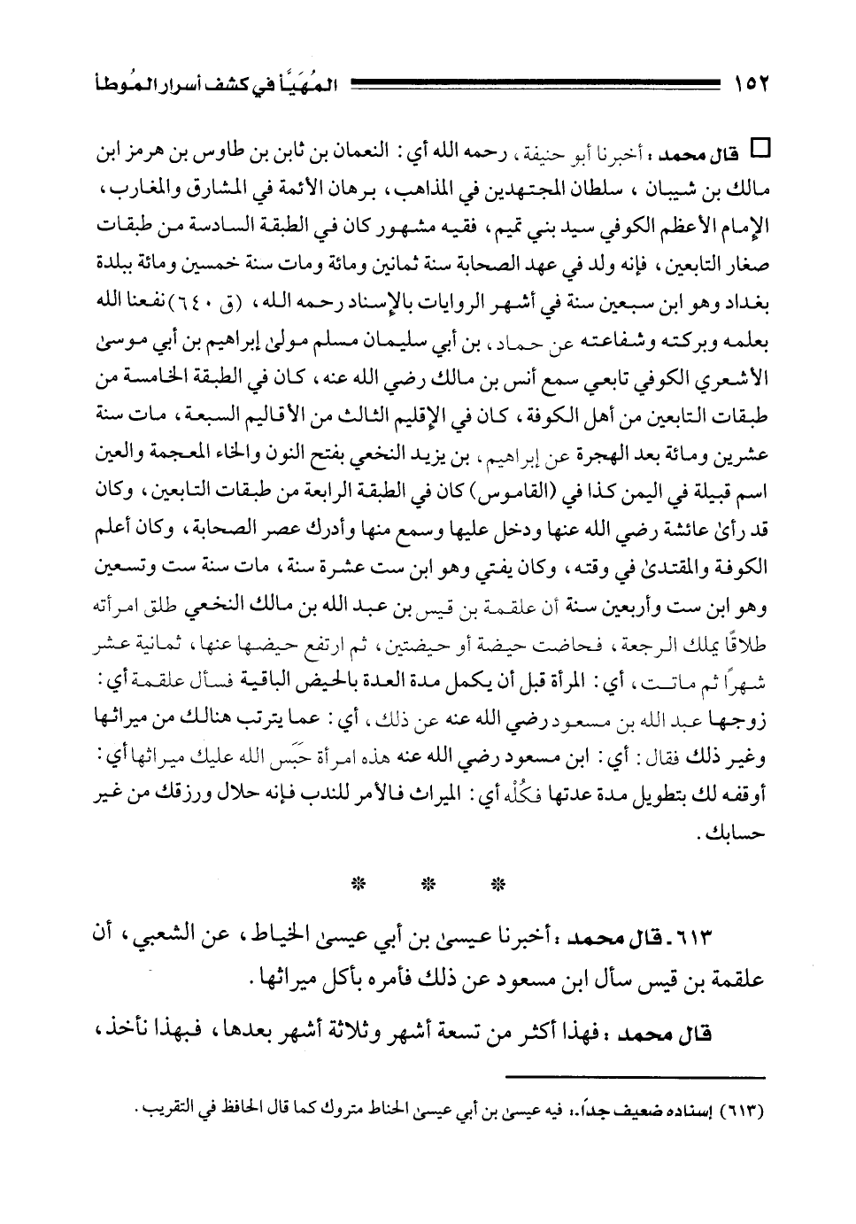 • قال محمد: أخبرنا أبو حنيفة، رحمه الله أي: النعمان بن ثابن بن طاوس بن هرمز ابن مالك بن شيبان، سلطان المجتهدين في المذاهب، برهان الأئمة في المشارق والمغارب، الإِمام الأعظم الكوفي سيد بني تميم، فقيه مشهور كان في الطبقة السادسة من طبقات صغار التابعين، فإنه ولد في عهد الصحابة سنة ثمانين ومائة ومات سنة خمسين ومائة ببلدة بغداد وهو ابن سبعين سنة في أشهر الروايات بالإِسناد رحمه الله، (ق 640) نفعنا الله بعلمه وبركته وشفاعته عن حماد، بن أبي سليمان مسلم مولى إبراهيم بن أبي موسى الأشعري الكوفي تابعي سمع أنس بن مالك رضي الله عنه، كان في الطبقة الخامسة من طبقات التابعين من أهل الكوفة، كان في الإِقليم الثالث من الأقاليم السبعة، مات سنة عشرين ومائة بعد الهجرة عن إبراهيم، بن يزيد النخعي بفتح النون والخاء المعجمة والعين اسم قبيلة في اليمن كذا في (القاموس) كان في الطبقة الرابعة من طبقات التابعين، وكان قد رأى عائشة رضي الله عنها ودخل عليها وسمع منها وأدرك عصر الصحابة، وكان أعلم الكوفة والمقتدى في وقته، وكان يفتي وهو ابن ست عشرة سنة، مات سنة ست وتسعين وهو ابن ست وأربعين سنة أن علقمة بن قيس بن عبد الله بن مالك النخعي طلق امرأته طلاقًا يملك الرجعة، فحاضت حيضة أو حيضتين، ثم ارتفع حيضها عنها، ثمانية عشر شهرًا ثم ماتت، أي: المرأة قبل أن يكمل مدة العدة بالحيض الباقية فسأل علقمة أي: زوجها عبد الله بن مسعود رضي الله عنه عن ذلك، أي: عما يترتب هنالك من ميراثها وغير ذلك فقال: أي: ابن مسعود رضي الله عنه هذه امرأة حَبَس الله عليك ميراثها أي: أوقفه لك بتطويل مدة عدتها فكُلْه أي: الميراث فالأمر للندب فإنه حلال ورزقك من غير حسابك.