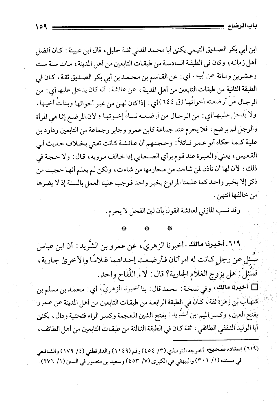 619 - أخبرنا مالك، أخبرشا الزهريّ، عن عمرو بن الشَّريد: أن ابن عباس سُئِل عن رجلٍ كانت له امرأتان فأرضعت إحداهما غلامًا والأخرى جارية، فسُئِلَ: هل يزوج الغلام الجارية؟ قال: لا، اللَّقاح واحد.