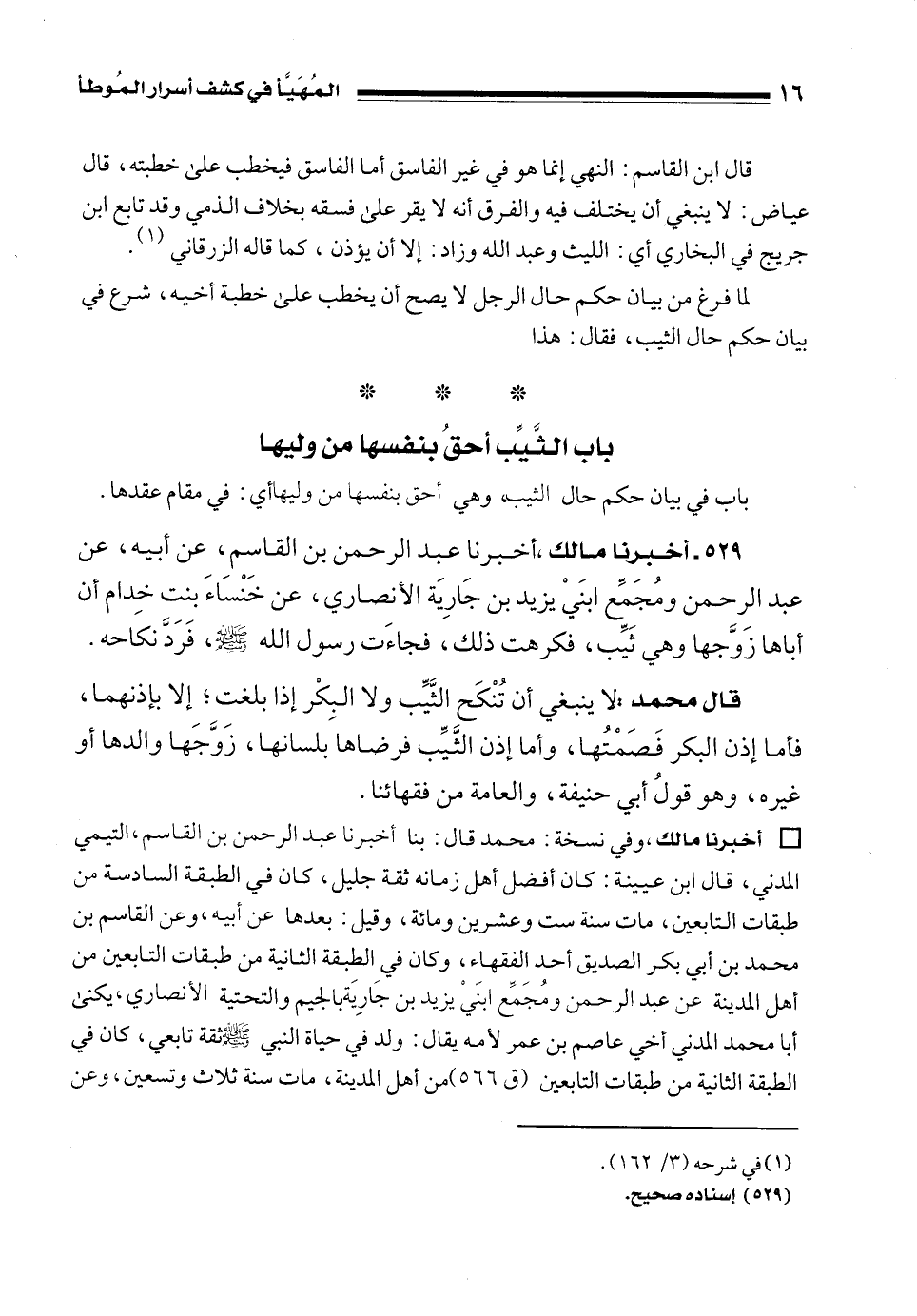 529 - أخبرنا مالك، أخبرنا عبد الرحمن بن القاسم، عن أبيه، عن عبد الرحمن ومُجَمِّع ابنَيْ يزيد بن جَارِيَة الأنصاري، عن خَنْسَاءَ بنت خِدام أن أباها زَوَّجها وهي ثَيِّب، فكرهت ذلك، فجاءَت رسول الله - صلى الله عليه وسلم -، فَرَدَّ نكاحه.