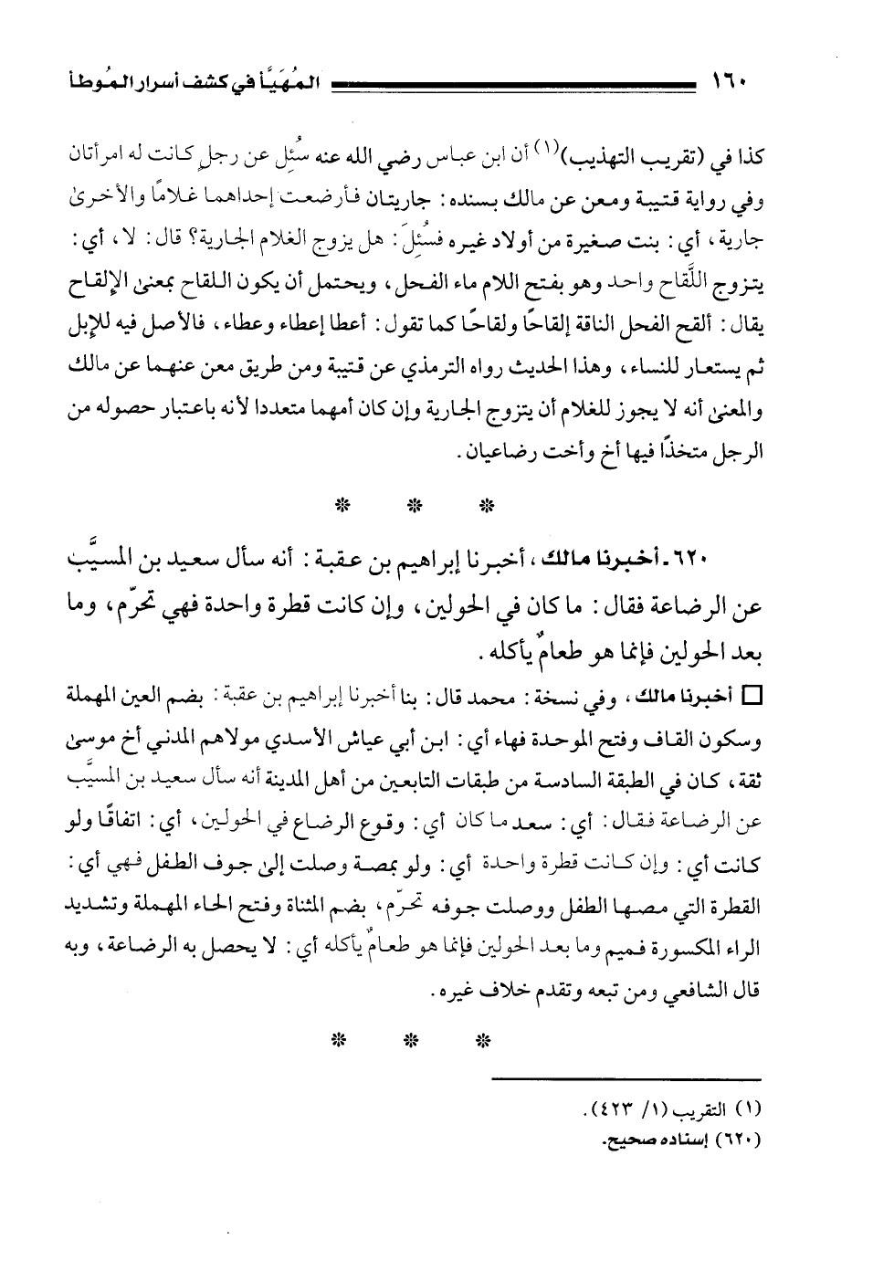 620 - أخبرنا مالك، أخبرنا إبراهيم بن عقبة: أنه سأل سعيد بن المسيَّب عن الرضاعة فقال: ما كان في الحولين، وإن كانت قطرة واحدة فهي تحرّم، وما بعد الحولين فإنما هو طعامٌ يأكله.