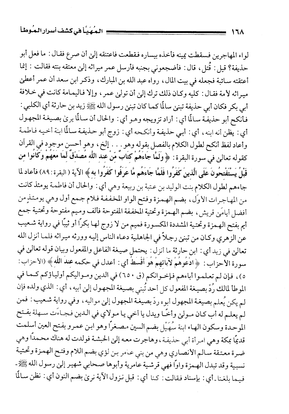 لواء المهاجرين فسقطت يمينه فأخذه بيساره فقطعت فاعتنقه إلى أن صرع فقال: ما فعل أبو حذيفة؟ قيل: قُتل، قال: فأضجعوني بجنبه فأرسل عمر ميراثه إلى معتقه بنته فقالت: إنما أعتقته سائبة فجعله في بيت المال، رواه عبد الله بن المبارك، وذكر ابن سعد أن عمر أعطى ميراثه لأمة فقال: كليه وكان ذلك ترك إلى أن تولى عمر، وإلا فاليمامة كانت في خلافة أبي بكر فكان أبي حذيفة تبنى سالمًا كما كان تبنى رسول الله - صلى الله عليه وسلم - زيد بن حارثة أي الكلبي: فأنكح أبو حذيفة سالمًا أي: أراد تزويجه وهو أي: والحال أن سالمًا يرى بصيغة المجهول أي: يظن أنه ابنه، أي: أبي حذيفة وأنكحه أي: زوج أبو حذيفة سالمًا ابنة أخيه فاطمة وأعاد لفظ أنكح لطول الكلام بالفصل بقوله وهو. . . إلخ، وهو أحسن موجود في القرآن كقوله تعالى في سورة البقرة: {وَلَمَّا جَاءَهُمْ كِتَابٌ مِنْ عِنْدِ اللَّهِ مُصَدِّقٌ لِمَا مَعَهُمْ وَكَانُوا مِنْ قَبْلُ يَسْتَفْتِحُونَ عَلَى الَّذِينَ كَفَرُوا فَلَمَّا جَاءَهُمْ مَا عَرَفُوا كَفَرُوا بِهِ} الآية [البقرة: 89] فأعاد لما جاءهم لطول الكلام بنت الوليد بن عتبة بن ربيعة وهي أي: والحال أن فاطمة يومئذ كانت من المهاجرات الأوَل، بضم الهمزة وفتح الواو المخففة فلام جمع أول وهي يومئذٍ من أفضل أيامَى قريش، بضم الهمزة وتحتية المخففة الفتوحة فألف وميم مفتوحة وتحتية جمع أيم بفتح الهمزة وتحتية المشددة المكسورة فميم من لا زوج لها بكرًا أو ثيبًا في رواية شعيب عن الزهري وكان من تبنى رجلًا في الجاهلية دعاه الناس إليه وورثه ميراثه فلما أنزل الله تعالى في زيد أي: ابن حارثة ما أنزل: يحتمل صيغة الفاعل والمفعول وبيان قوله تعالى في سورة الأحزاب: {ادْعُوهُمْ لِآبَائِهِمْ هُوَ أَقْسَطُ} أي: أعدل في حكمه {عِنْدَ اللَّهِ} [الأحزاب: 5]، فإن لم تعلموا آباءهم فإخوانكم (ق 650) في الدين ومواليكم أولياؤكم كما في الموطأ لمالك رُدّ بصيغة المفعول كل أحد تُبني بصيغة المجهول إلى أبيه، أي: الذي ولده فإن لم يكن يُعلم بصيغة المجهول أبوه ردّ بصيغة المجهول إلى مواليه، وفي رواية شعيب: فمن لم يعلم له أب كان مولى وأخًا ويدل يا أخي يا مولاي في الدين فجاءَت سهلة بفتح الموحدة وسكون الهاء ابنة سُهَيْل بضم السين مصغرًا وهو ابن عمرو بفتح العين أسلمت قديمًا بمكة وهي امرأة أبي حذيفة، وهاجرت معه إلى الحبشة فولدت له هناك محمدًا وهي ضرة معتقة سالم الأنصاري وكي من بني عامر بن لؤي بضم اللام وفتح الهمزة وتحتية نسبية وقد تبدل الهمزة واوًا فهي قرشية عامرية وأبوها صحابي شهير إلى رسول الله - صلى الله عليه وسلم - فيما بلغنا - أي: بإسناد فقالت: كنا أي: قبل نزول الآية نرى بضم النون أي: نظن سالمًا