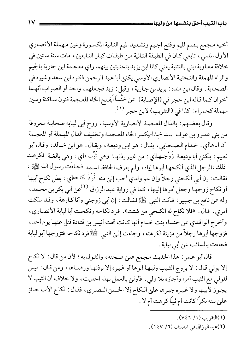 قال أبو عمر: هذا الحديث مجمع على صحته، والقول به؛ لأن من قال: لا نكاح إلا بولي قال: لا يزوج الثيب وليها أبوها أو غيره إلا بإذنها ورضاها، ومن قال: ليس للولي مع الثيب أمرا وأجازه بلا ولي، فأولى بالعمل بهذا الحديث، ولا خلاف أن الثيب لا يجوز لأبيها ولا غيره جبرها على النكاح إلا الحسن البصري، فقال: نكاح الأب جائز على بنته بكرًا كانت أم ثيبًا كرهت أم لا.