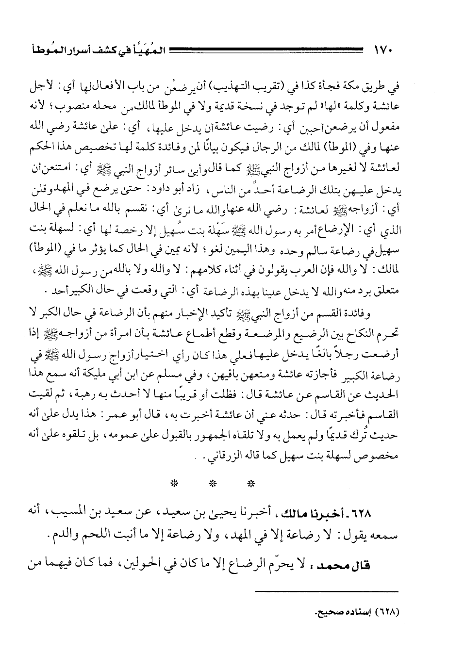 628 - أخبرنا مالك، أخبرنا يحيى بن سعيد، عن سعيد بن المسيب، أنه سمعه يقول: لا رضاعة إلا في المهد، ولا رضاعة إلا ما أثبت اللحم والدم.
