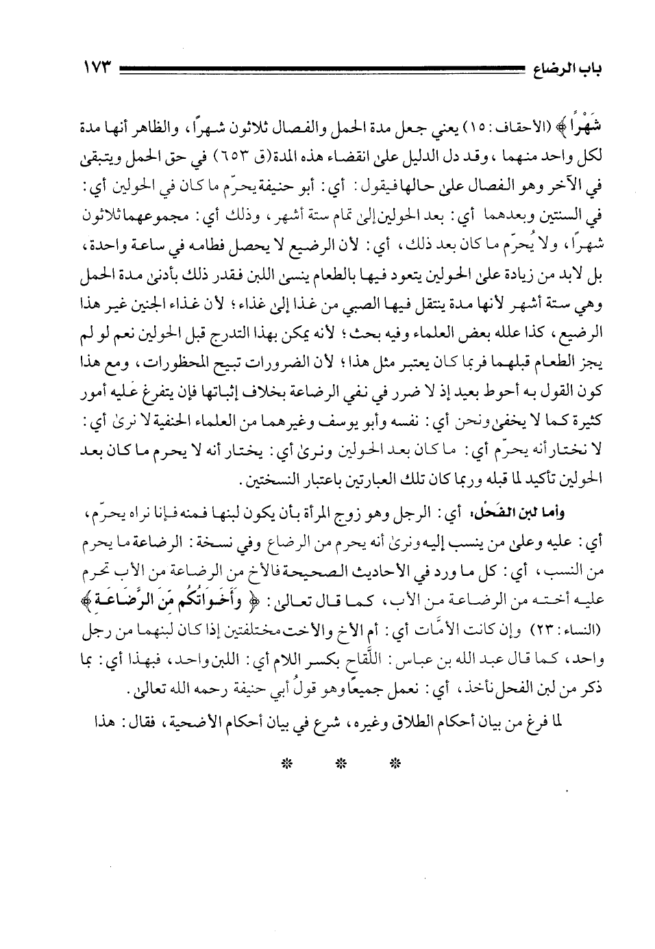 شَهْرًا} [الأحقاف: 15] يعني جعل مدة الحمل والفصال ثلاثون شهرًا، والظاهر أنها مدة لكل واحد منهما، وقد دل الدليل على انقضاء هذه المدة (ق 653) في حق الحمل ويتبقى في الآخر وهو الفصال على حالها فيقول: أي: أبو حنيفة يحرّم ما كان في الحولين أي: في السنتين وبعدهما أي: بعد الحولين إلى تمام ستة أشهر، وذلك أي: مجموعهما ثلاثون شهرًا, ولا يُحرّم ما كان بعد ذلك، أي: لأن الرضيع لا يحصل فطامه في ساعة واحدة، بل لا بد من زيادة على الحولين يتعود فيها بالطعام ينسى اللبن فقدر ذلك بأدنى مدة الحمل وهي ستة أشهر لأنها مدة ينتقل فيها الصبي من غذا إلى غذاء؛ لأن غذاء الجنين غير هذا الرضيع، كذا علله بعض العلماء وفيه بحث؛ لأنه يمكن بهذا التدرج قبل الحولين نعم لو لم يجز الطعام قبلهما فربما كان يعتبر مثل هذا؛ لأن الضرورات تبيح المحظورات، ومع هذا كون القول به أحوط بعيد إذ لا ضرر في نفي الرضاعة بخلاف إثباتها فإن يتفرغ عليه أمور كثيرة كما لا يخفى ونحن أي: نفسه وأبو يوسف وغيرهما من العلماء الحنفية لا نرى أي: لا نختار أنه يحرّم أي: ما كان بعد الحولين ونرى أي: يختار أنه لا يحرم ما كان بعد الحولين تأكيد لما قبله وربما كان تلك العبارتين باعتبار النسختين.