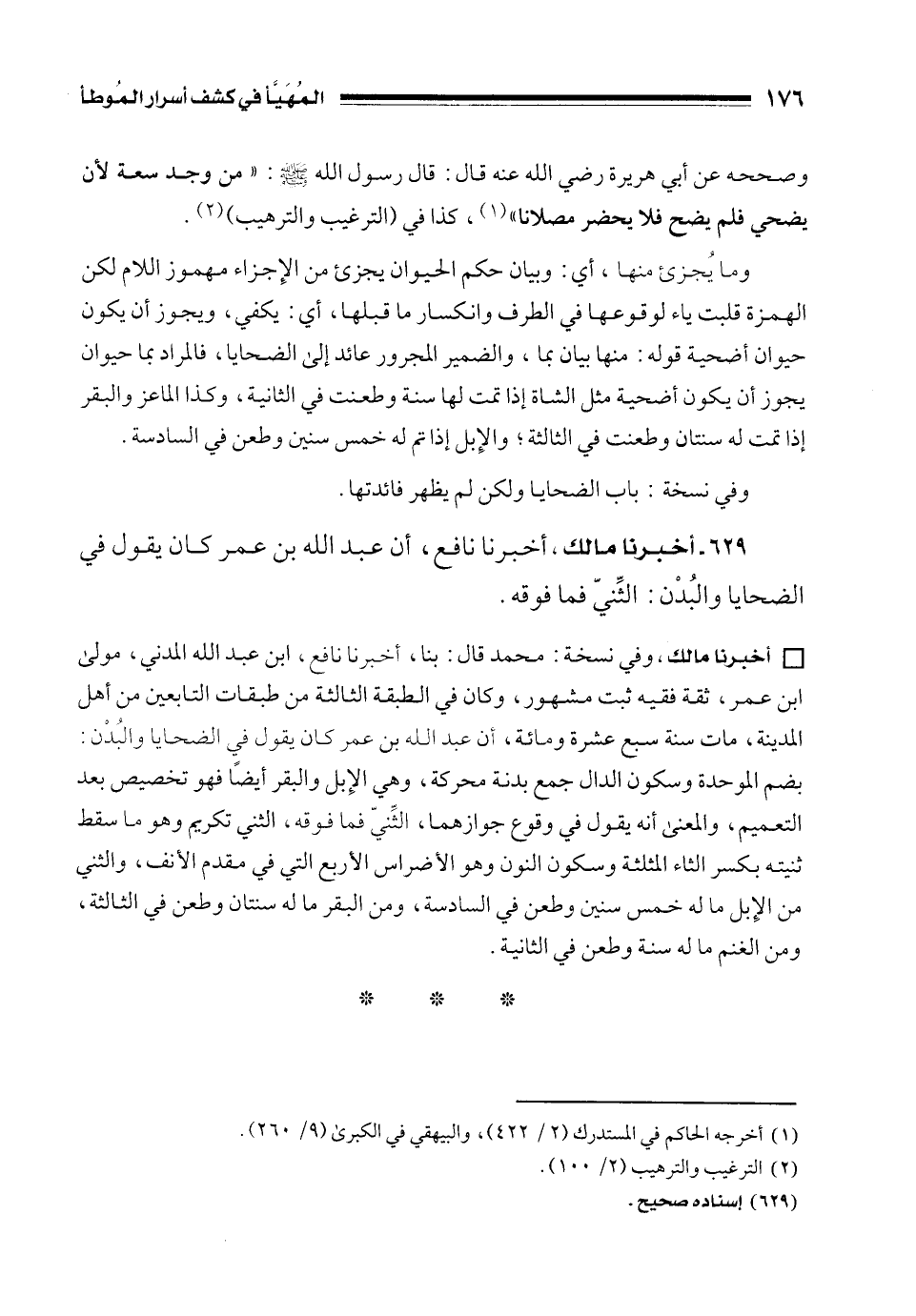 629 - أخبرنا مالك, أخبرنا نافع، أن عبد الله بن عمر كان يقول في الضحايا والبُدْن: الثِّنيّ فما فوقه.